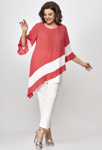 Это романтичный и женственный фасон блузки, которая выглядит очень актуально, украсит любой женский гардероб и станет палочкой-выручалочкой на любой случай жизни. Блузка женская прямого силуэта расширенная к низу.Верхняя часть отлетная,нижняя часть немного длиннее.Низ изделия фигурный -перед короче,а спинка длиннее. Вырез горловины круглый. Рукав втачной одношовный из трех частей создающих " фонарики",низ рукава на резинке. Украшение в комплект не входит.