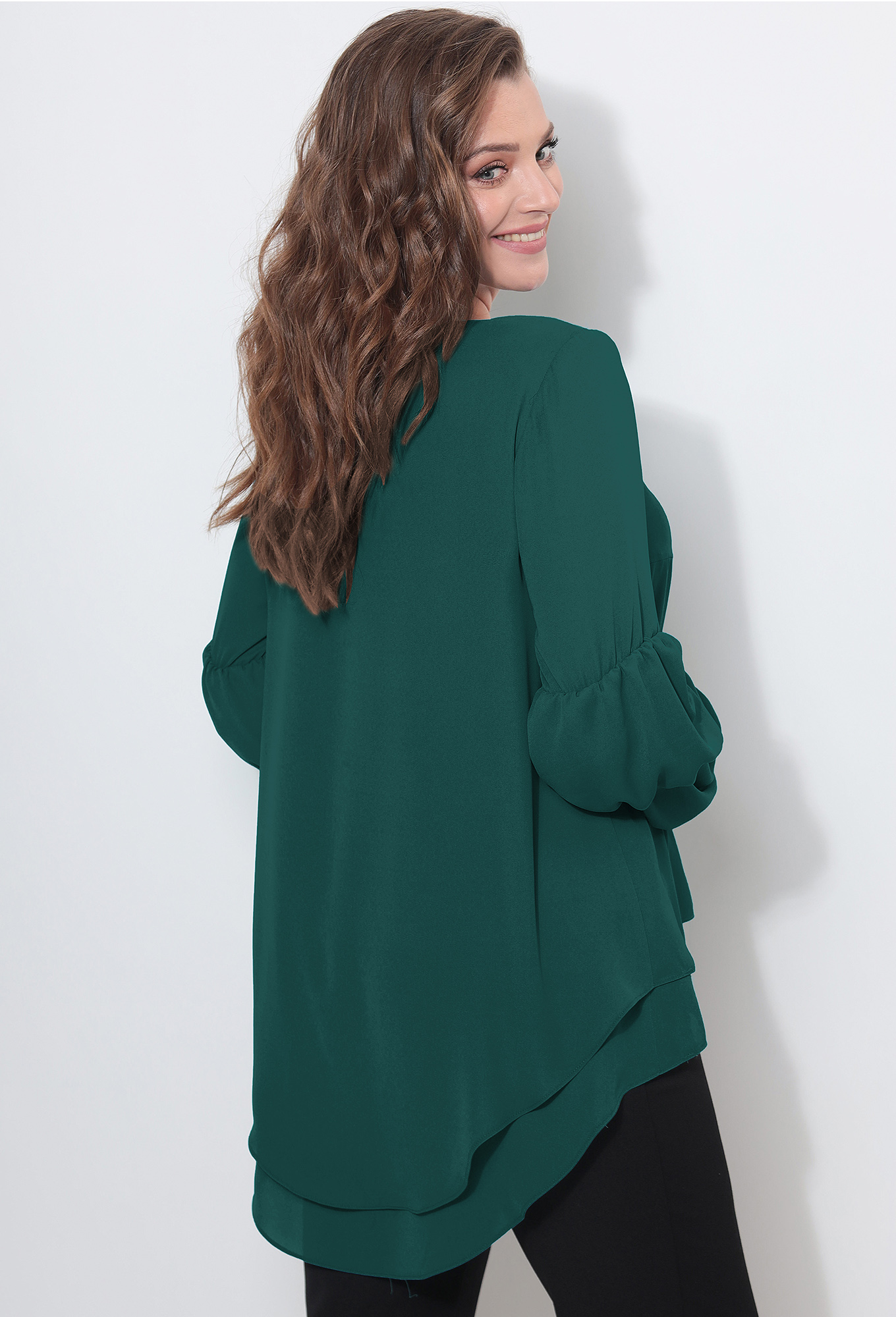 Это романтичный и женственный фасон блузки, которая выглядит очень актуально, украсит любой женский гардероб и станет палочкой-выручалочкой на любой случай жизни. Блузка женская прямого силуэта расширенная к низу.Верхняя часть отлетная,нижняя часть немного длиннее.Низ изделия фигурный -перед короче,а спинка длиннее. Вырез горловины круглый. Рукав втачной одношовный из трех частей создающих " фонарики",низ рукава на резинке. Украшение в комплект не входит.
