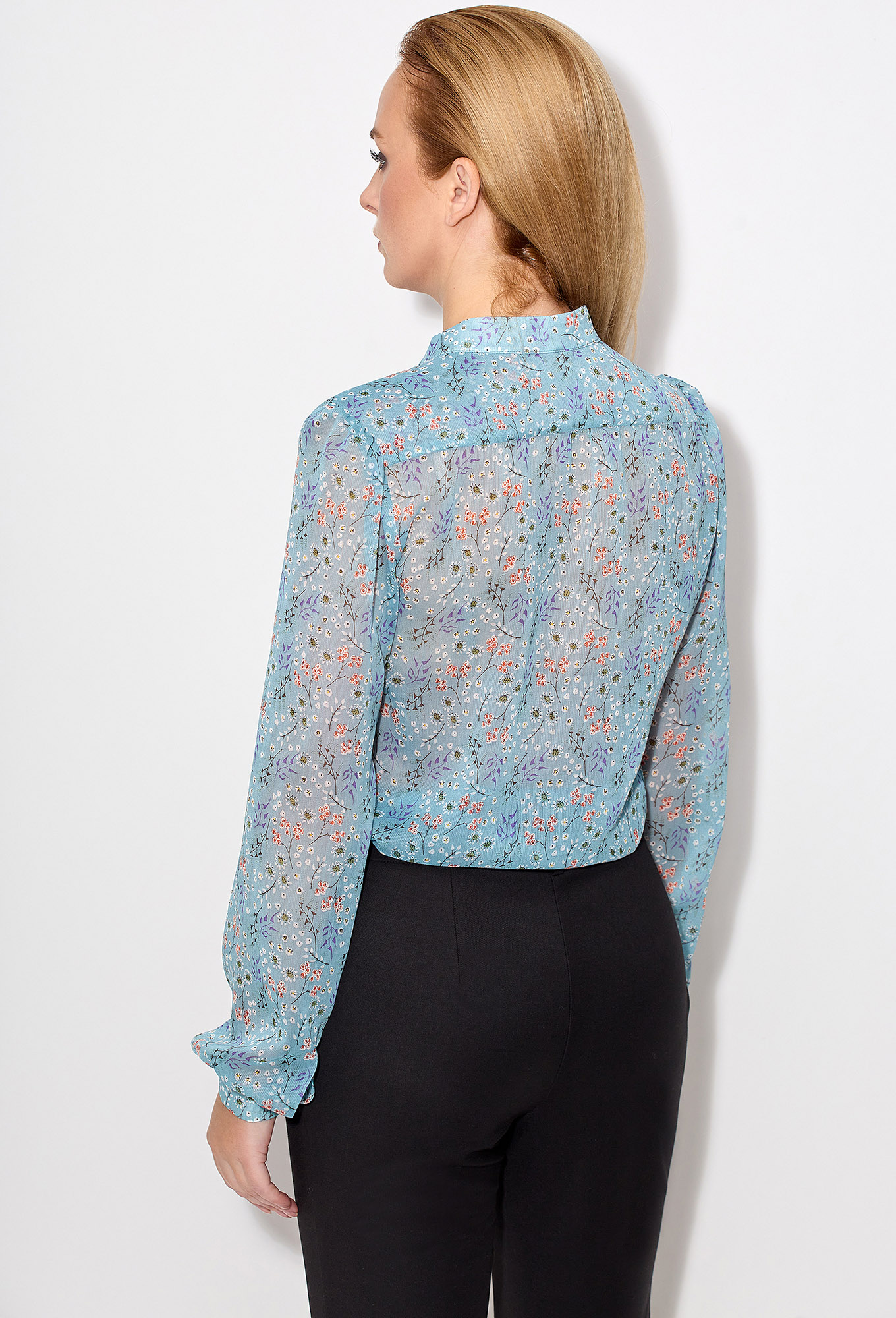Блузка прямого силуэта с фигурным асимметричным низом. По переду нагрудная вытачка. По спинке кокетка. Рукав длинный одношовный втачной с притачной манжетой на петлю-пуговицу. Воротник-стойка с цельнокроеной завязкой. V-образный вырез горловины по центральной части переда. По горловине переда, нижней части спинки, окату и низу рукава сборка.