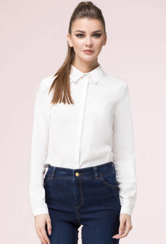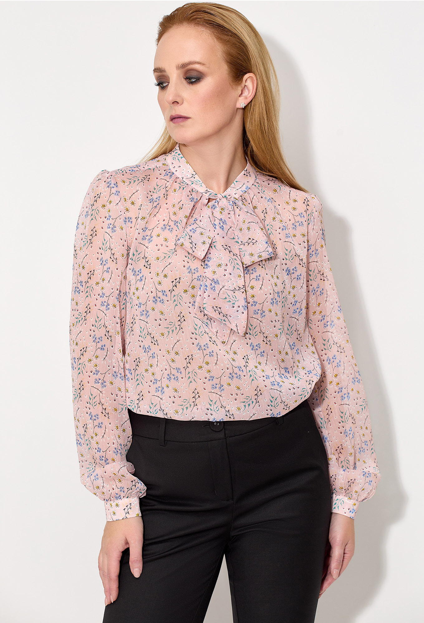 Блузка прямого силуэта с фигурным асимметричным низом. По переду нагрудная вытачка. По спинке кокетка. Рукав длинный одношовный втачной с притачной манжетой на петлю-пуговицу. Воротник-стойка с цельнокроеной завязкой. V-образный вырез горловины по центральной части переда. По горловине переда, нижней части спинки, окату и низу рукава сборка.