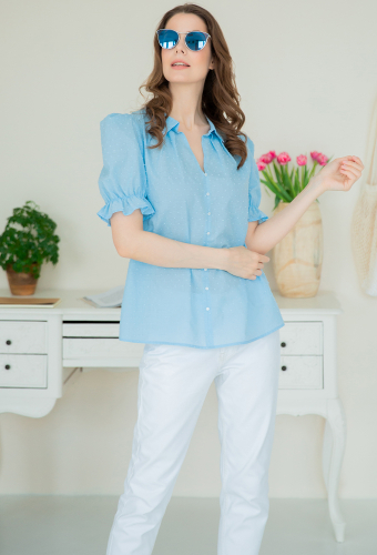 Блузка женская полуприлегающего силуэта со сборкой по горловине и V-образным вырезом. Рукав короткий, втачной. По горловине декоративная планка переходящая в завязку-бант. Блузка выполнена из нежной, легкой, струящейся ткани. Будет прекрасным дополнением к повседневным, офисным, а также нарядным капсулам. Ткань не мнется, что обеспечит ухоженный и аккуратный внешний вид.