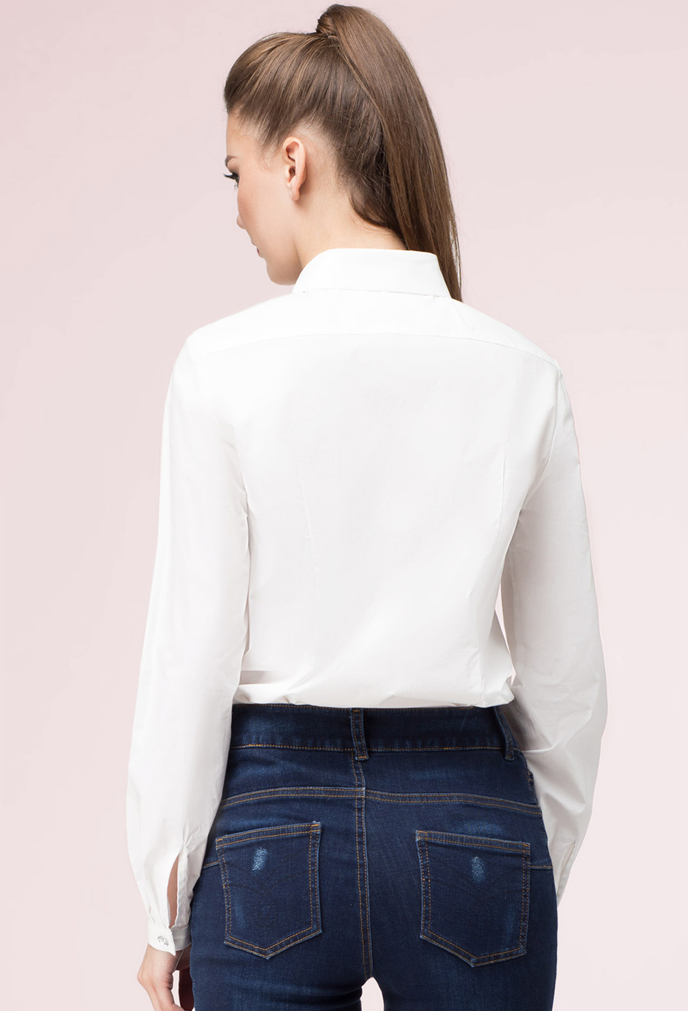 Рубашка полуприлегающего силуэта с фигурным асимметричным низом.Перед с нагрудной вытачкой. По спинке кокетка и талиевые вытачки. Рукав длинный втачной одношовный с притачной манжетой и складками по низу и планкой застегивающаяся на петли и пуговицы.Воротник стояче-отложной с отрезной стойкой.Застежка с цельнокроеной потайной планкой на петли и пуговицы .