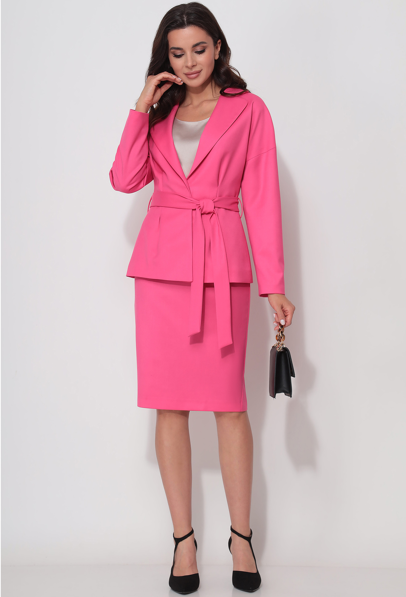 Комплект женский состоящий из жакета, блузки и юбки. Жакет полуприлегающий на подкладке. По переду на талии застрочная складка. Воротник пиджачного типа, застежка на две потойные кнопки. Рукав втачной укороченный со спущенной линией плеча. Блузка женская полуприлегающего силуэта с круглым вырезом горловины, без рукава со спущенной линией проймы. Юбка на подкладке, немного зауженная к низу с притачным поясом и на резинке в размерах 50-54. По переднему полотнищу 4 талиевые вытачки. Застежка на потайную тесьму-молнию в среднем шве заднего полотнища и шлицей. В комплекте съемный пояс из основной ткани.