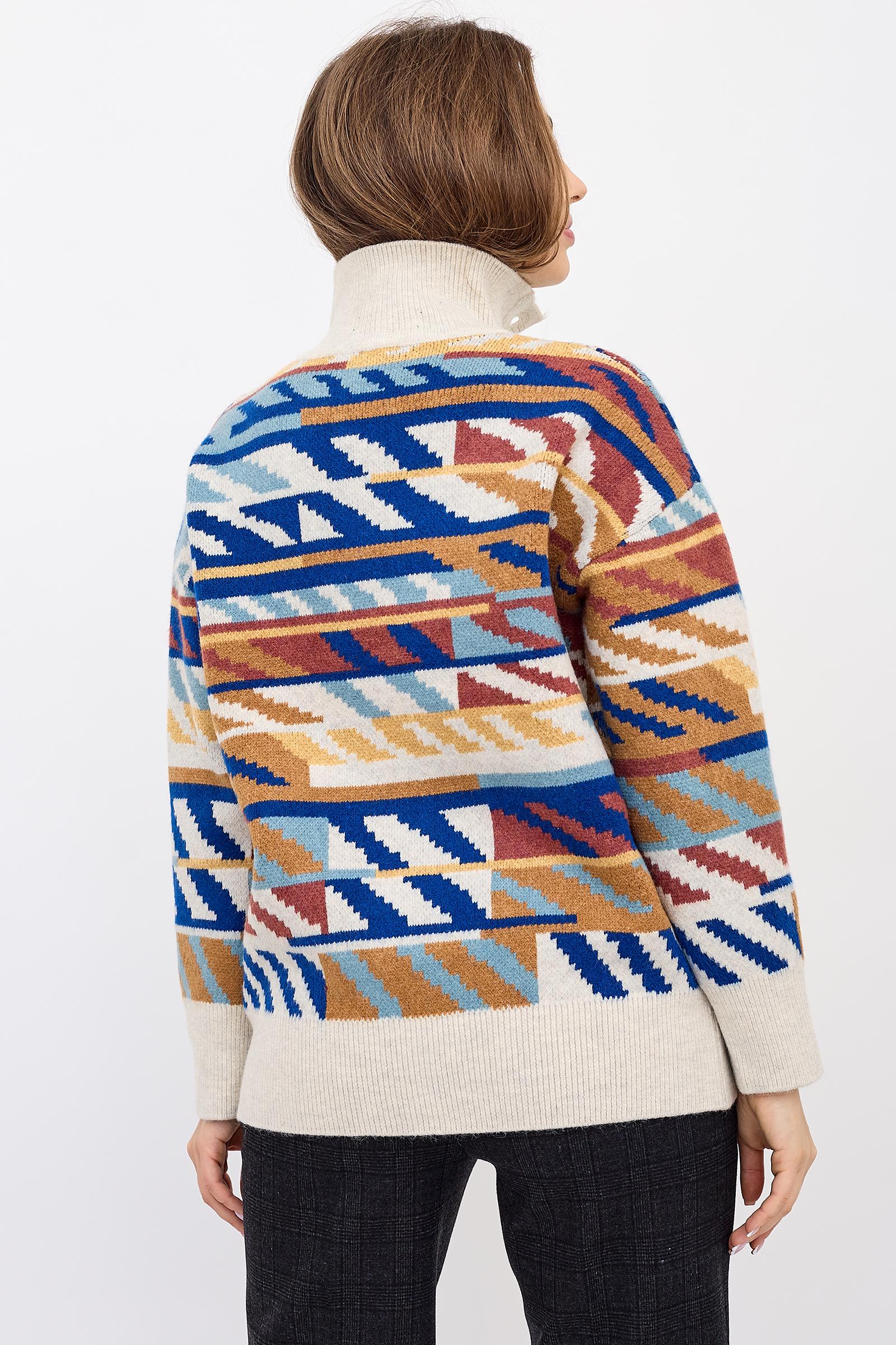 Привлекательный, яркий и очень теплый джемпер Камилла согреет в холодную погоду. Главное украшение джемпера - колоритный орнамент сочетает сразу несколько цветовых гамм. Воротник стоечка застегивается на пуговицы и тем самым делает модель еще более уютной и теплой. Широкие манжеты, воротник стойка и окантовка по низу модели джемпера выполнена плотной вязкой для сохранения тепла и удобства в ежедневной носке. Джемпер прост в уходе, допускается деликатная стирка и глажка. Хорошо сочетается с любыми вещами базового гардероба.