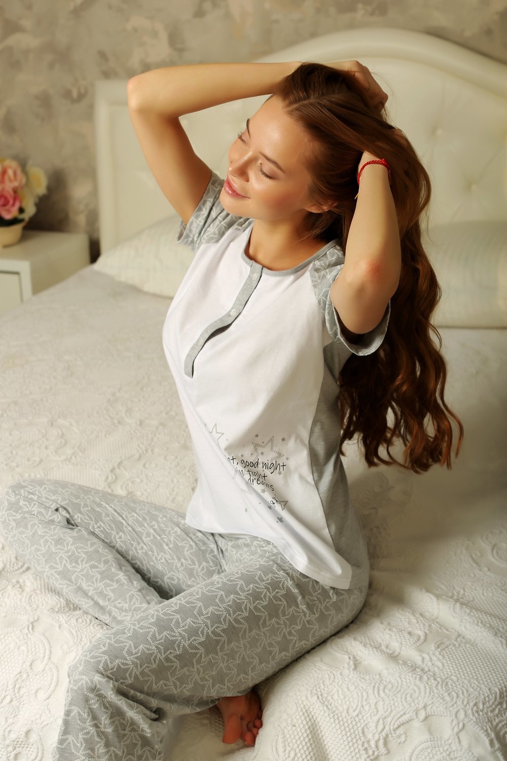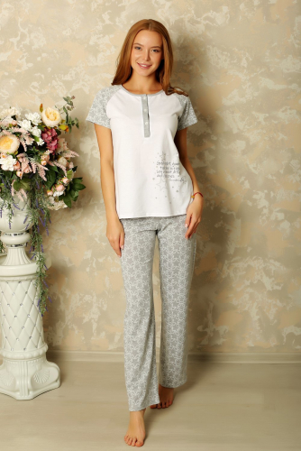 Женская пижама из качественной кулирки. В комплекте футболка прямого кроя и длинные брюки. Футболка комбинирована: полочка из белой ткани с принтом, а спинка из ткани с рисунком. Рукав реглан короткий. Круглый вырез горловины с функциональными пуговицами по планке. Брюки прямого кроя из ткани с рисунком, оборудованные двумя карманами. Такой комплект подарит вам комфортный сон.