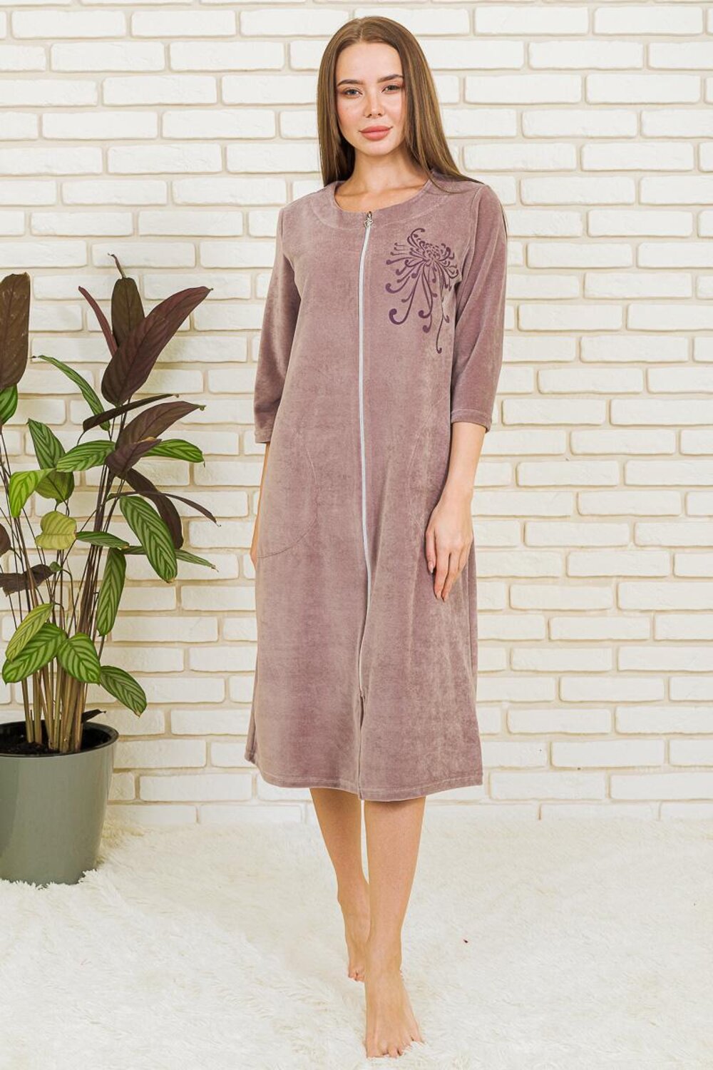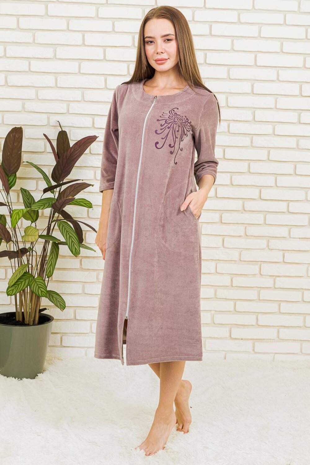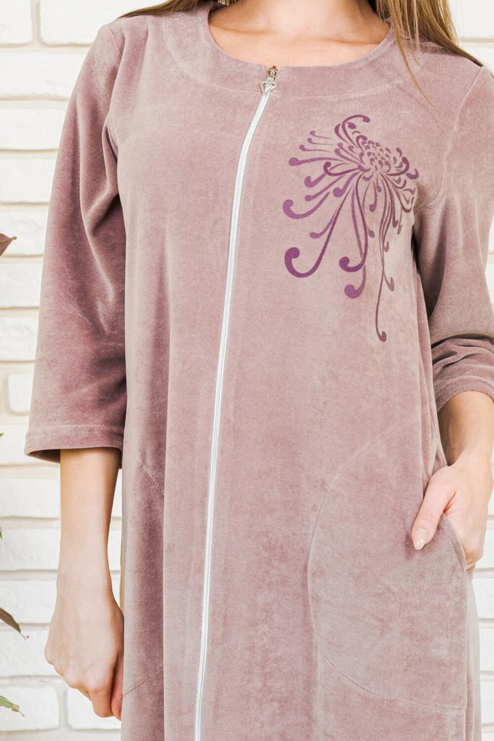 Женский велюровый халат с застёжкой на молнию. Модель прямого кроя с боковыми карманами. Рукав укороченный 3/4. На груди украшает узорный рисунок.