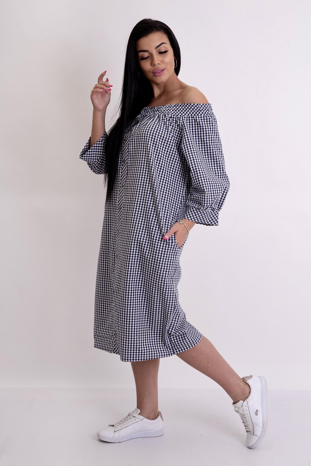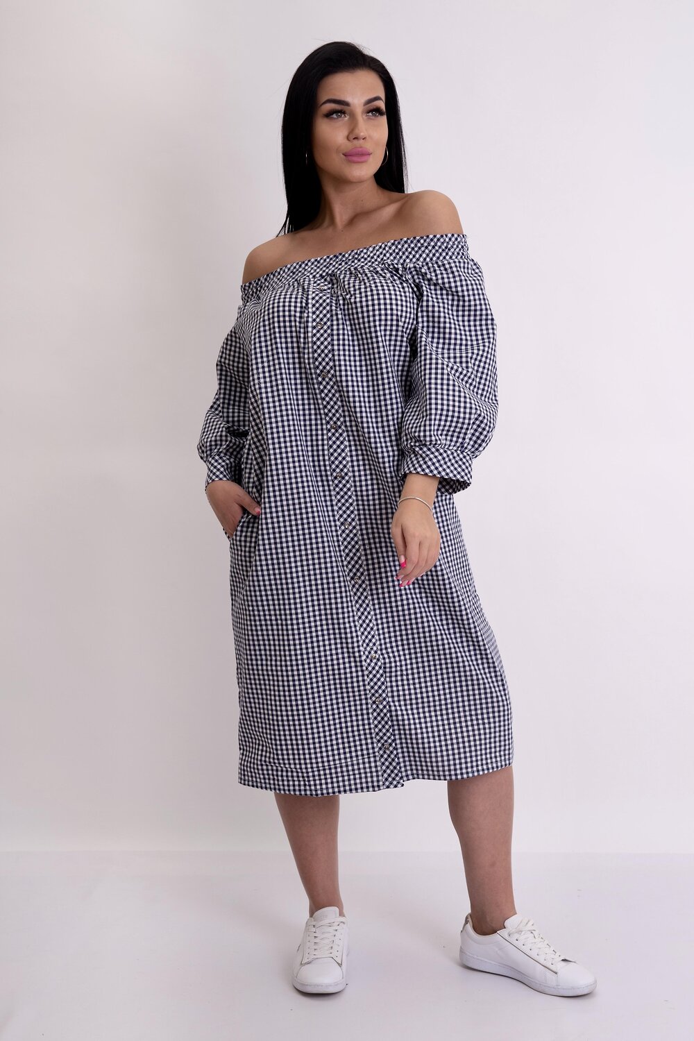 Изумительное летнее платье в клетку с горловым вырезом Анжелика. Модель прямого силуэта с карманами. Полочка украшена пуговицами по декоративной планке. Длинный рукав фонарик с манжеткой. В таком платье вы будете выглядеть модно и стильно.