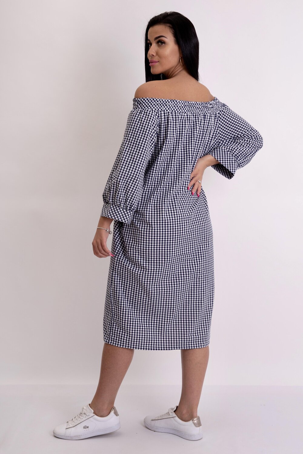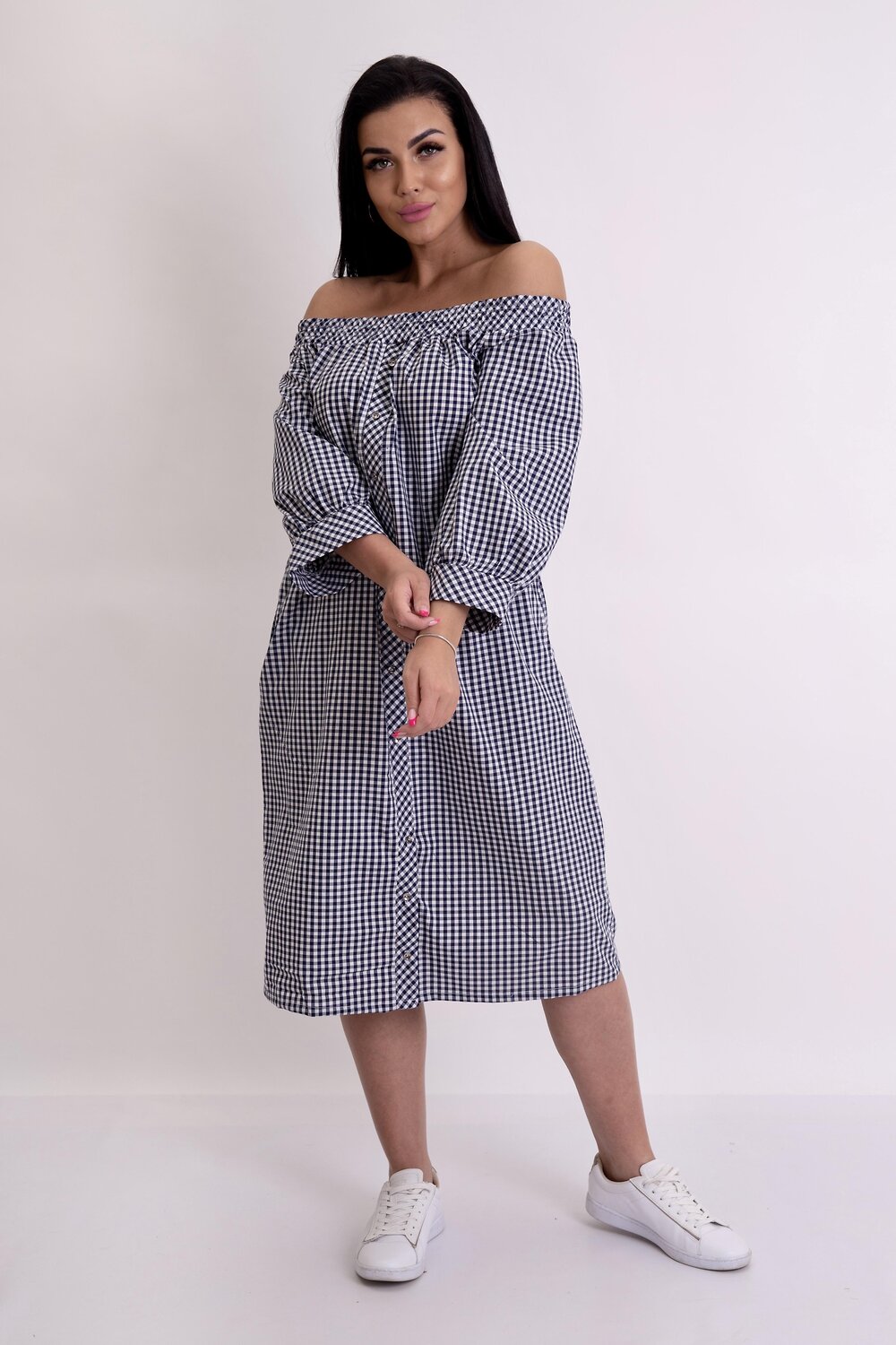 Изумительное летнее платье в клетку с горловым вырезом Анжелика. Модель прямого силуэта с карманами. Полочка украшена пуговицами по декоративной планке. Длинный рукав фонарик с манжеткой. В таком платье вы будете выглядеть модно и стильно.