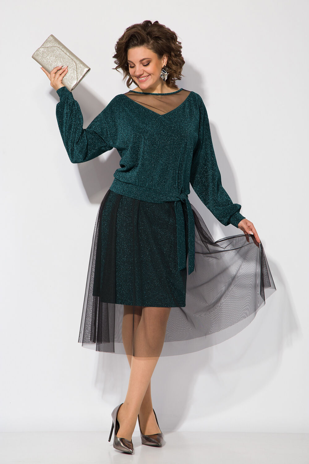 Роскошный нарядный юбочный костюм, состоящий из блузки и юбки! Модель выполнена из мягкого, комфортного трикотажного полотна с изнанки однотонного, с лица с эффектом мерцания. Блузка с округлым вырезом горловины, с V-образной кокеткой из сетки.  Плечевой пояс спущенный с длинным рукавом присборенным на манжеты. Низ оформлен притачной планкой-поясом, переходящий в завязку.  Юбка французской длины, за колено; на притачном поясе, расклешена к низу. Верх выполнен из сетки, низ выполнен из основной ткни. Мерцающая ткань, создают завораживающий эффект, поможет Вам выделиться из толпы, привлечь восхищенные взгляды, и быть в центре внимания на любом мероприятии!