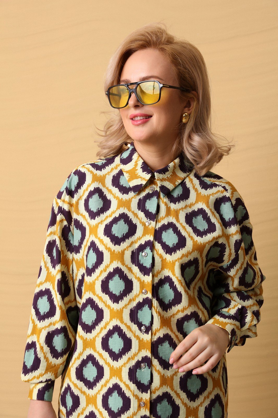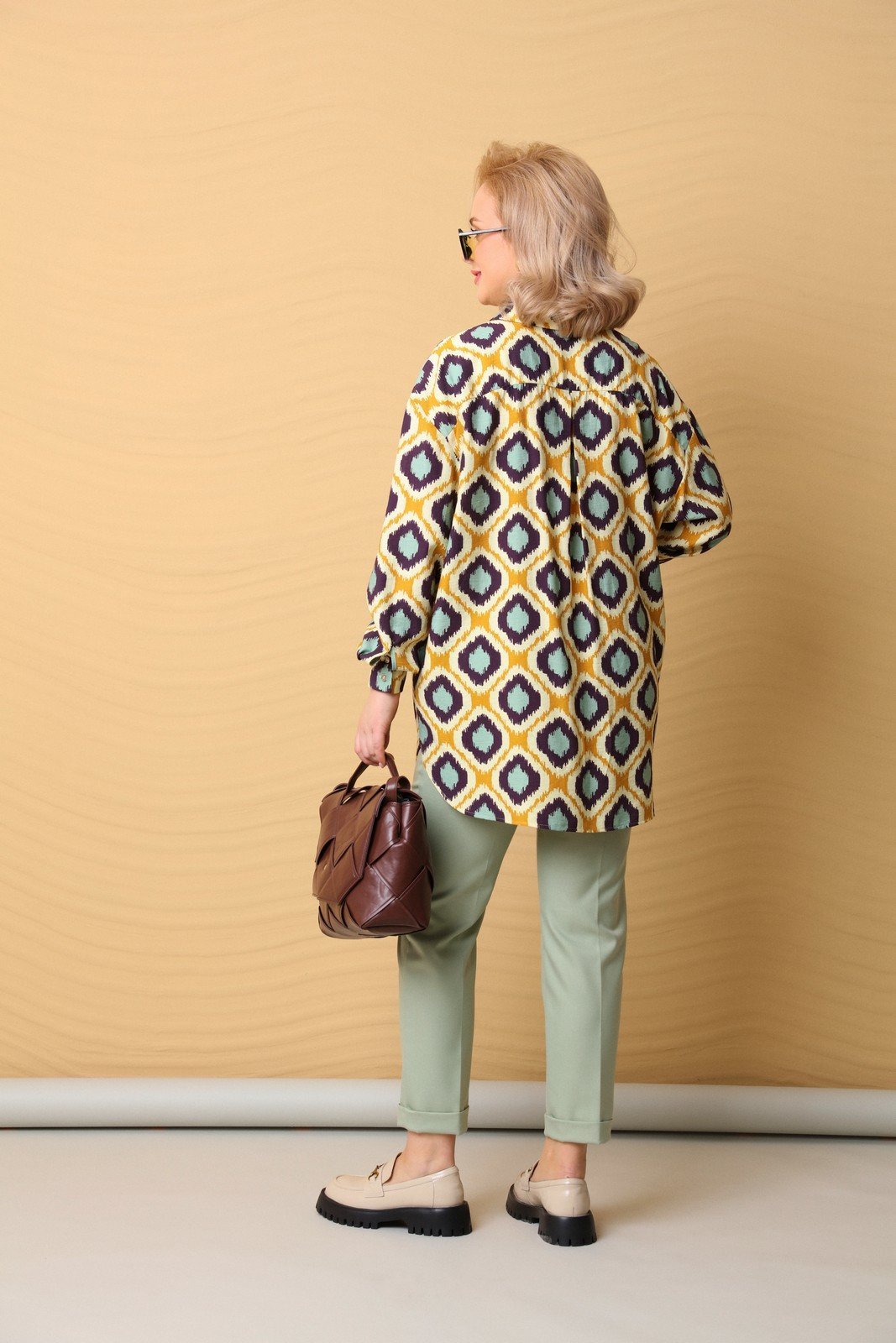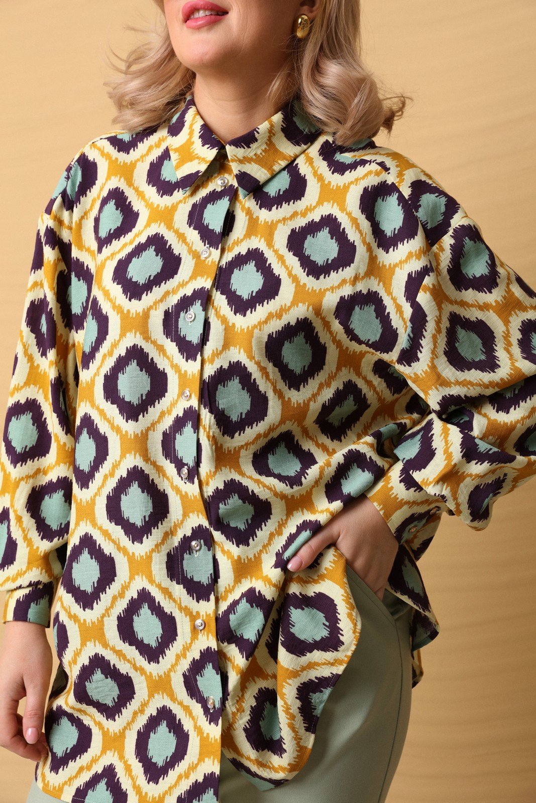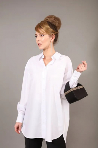 Блузка женская большого объема, прямого силуэта. На детали спинки расположена двойная кокетка, переходящая на деталь полочки. Под кокеткой на спинке встречная складка. Воротник рубашечный отложной на стойке. Застежка планка центральная на прорезные петли и пуговицы. Линия плеча спущенная, рукав рубашечный, длинный. В нижней части рукава заложены складки, заканчивается манжетой с двумя прорезными петлями и пуговицами. Низ блузки разноуровневый: спереди короче, сзади длиннее. Рост модели 170