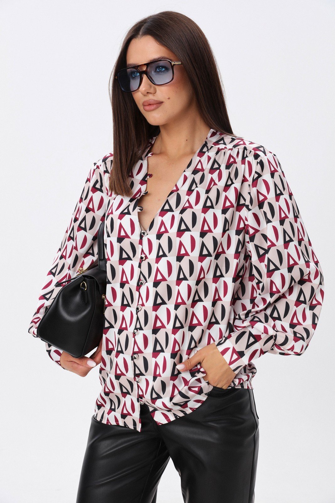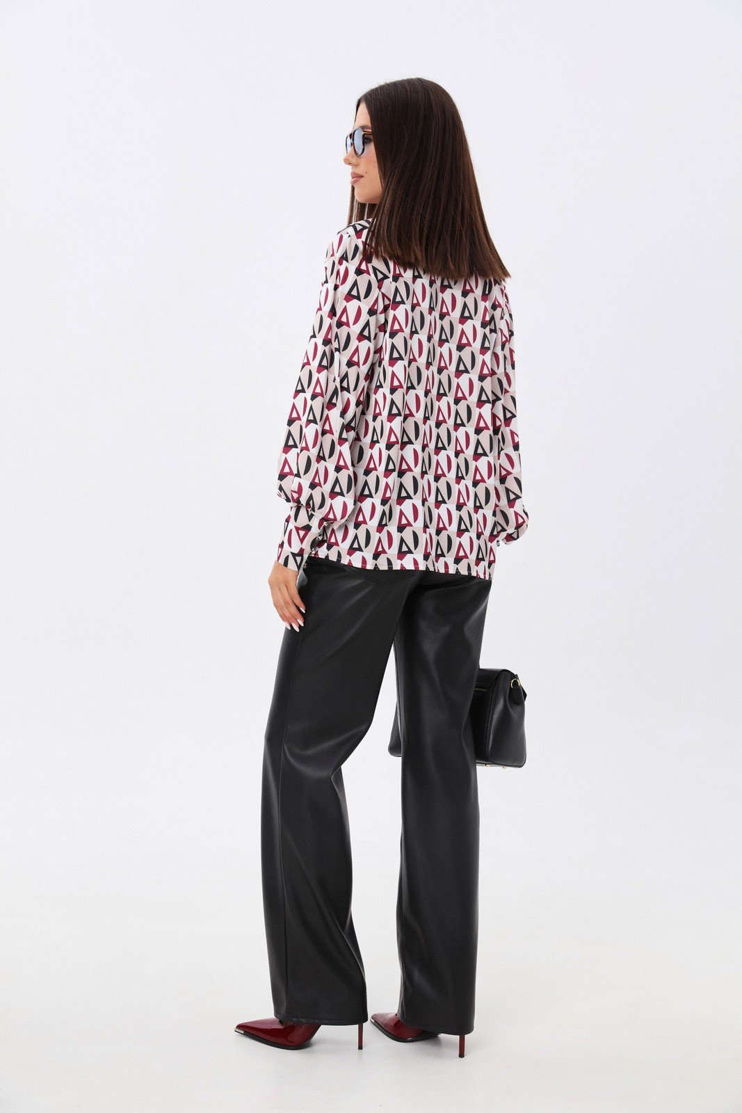 Изящная блуза из нежной ткани с геометрическим принтом. Блуза свободного силуэта с V-образным вырезом. Это довольно глубокий вырез, который прекрасно подчёркивает декольте и линию шеи. Застежка на навесные петли и пуговицы. Рукава длинные объёмные втачные заканчиваются широкой манжетой с застёжкой на навесные петли с пуговицами. Рост фотомодели 175 см.