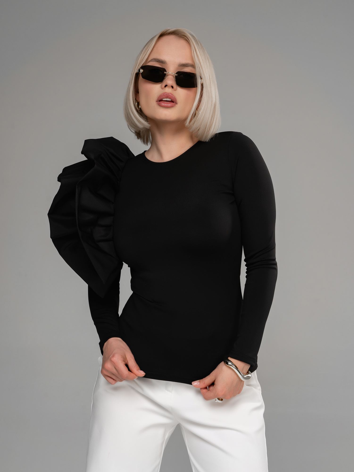 Женский лонгслив из бифлекса черного цвета с длинными рукавами прилегающего силуэта от российского производителя "FiftyPates". Модель выполнена из плотного матового синтетического полотна , который не теряет форму и обладает очень высокой эластичностью. При этом материал не мнется и не нуждается в глажении. На правом плече объемный атласный волан, который придает элегантности вашему образу. из бифлекса черного цвета Лонгслив женский красиво облегает фигуру и не стесняет движений. Вы будете выглядеть превосходно в любой ситуации - будь это повседневный или нарядный образ для праздничных и вечерних выходов. Лонгслив женский с длинными рукавами можно носить как блузку с юбкой или брюками. Идеально на весну и лето. Стильный лонгслив создаёт чувственный и эротичный образ, при этом он подчеркнет вашу красоту и индивидуальность.