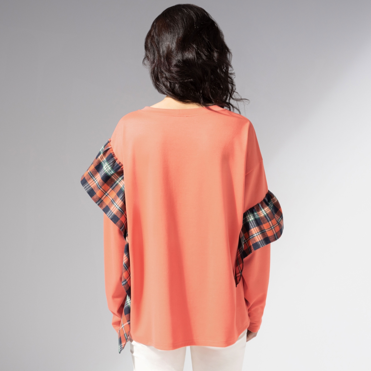 Лососевый оттенок – фаворит сезона, сочетающий мягкость и статус. Лонгслив ЧАРУТТИ создаёт настроение уверенной женственности, будто говорит: «Я выбираю комфорт и стиль, без компромиссов». Комфортный лонгслив из эластичного трикотажа антипилинг и клетчатой фланели. Воланы по рукавам добавляют динамику образу. Свободный крой, круглый вырез. Трикотаж пластичный, лёгкий в уходе.