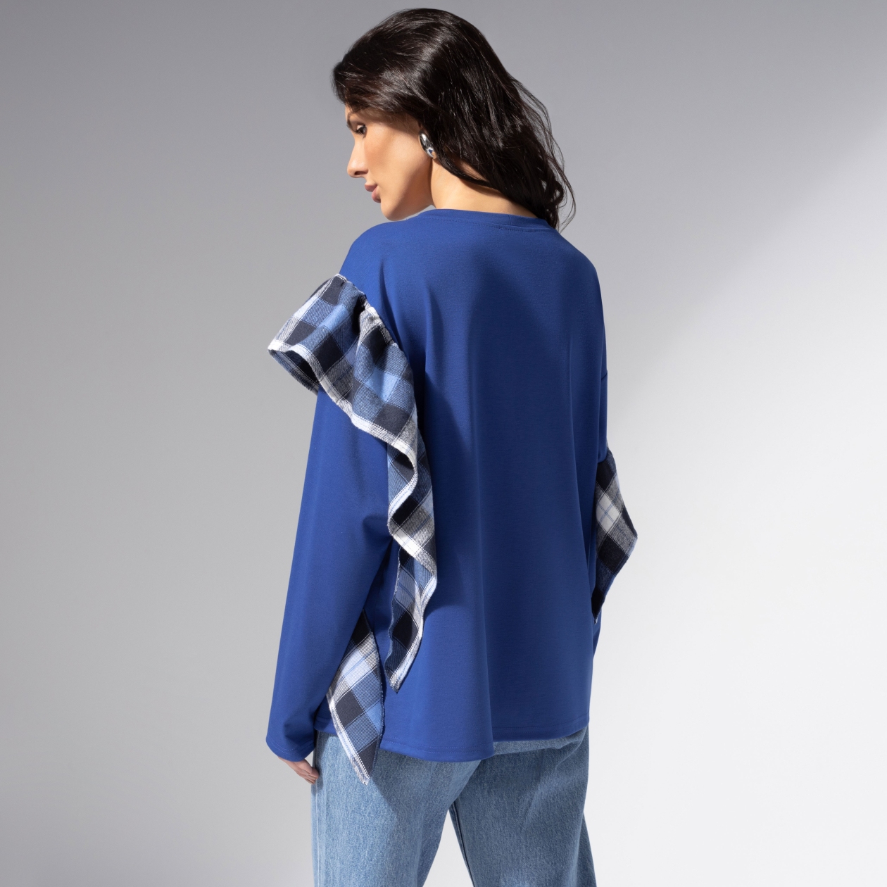 Трикотаж антипилинг. Вставки из клетчатой фланели формируют воланы по переду и рукавам. Свободный силуэт, круглый вырез, комфортная длина. Приятен к телу, сохраняет насыщенность цвета после стирок.