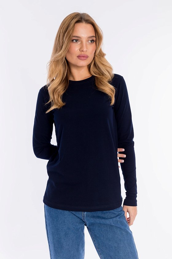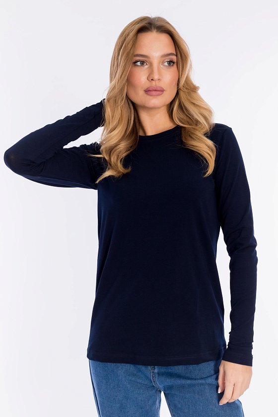 Лонгслив женский выполнен из однотонной кулирки с лайкрой. Модель с длинными рукавами и круглым вырезом горловины, оформленным планкой.