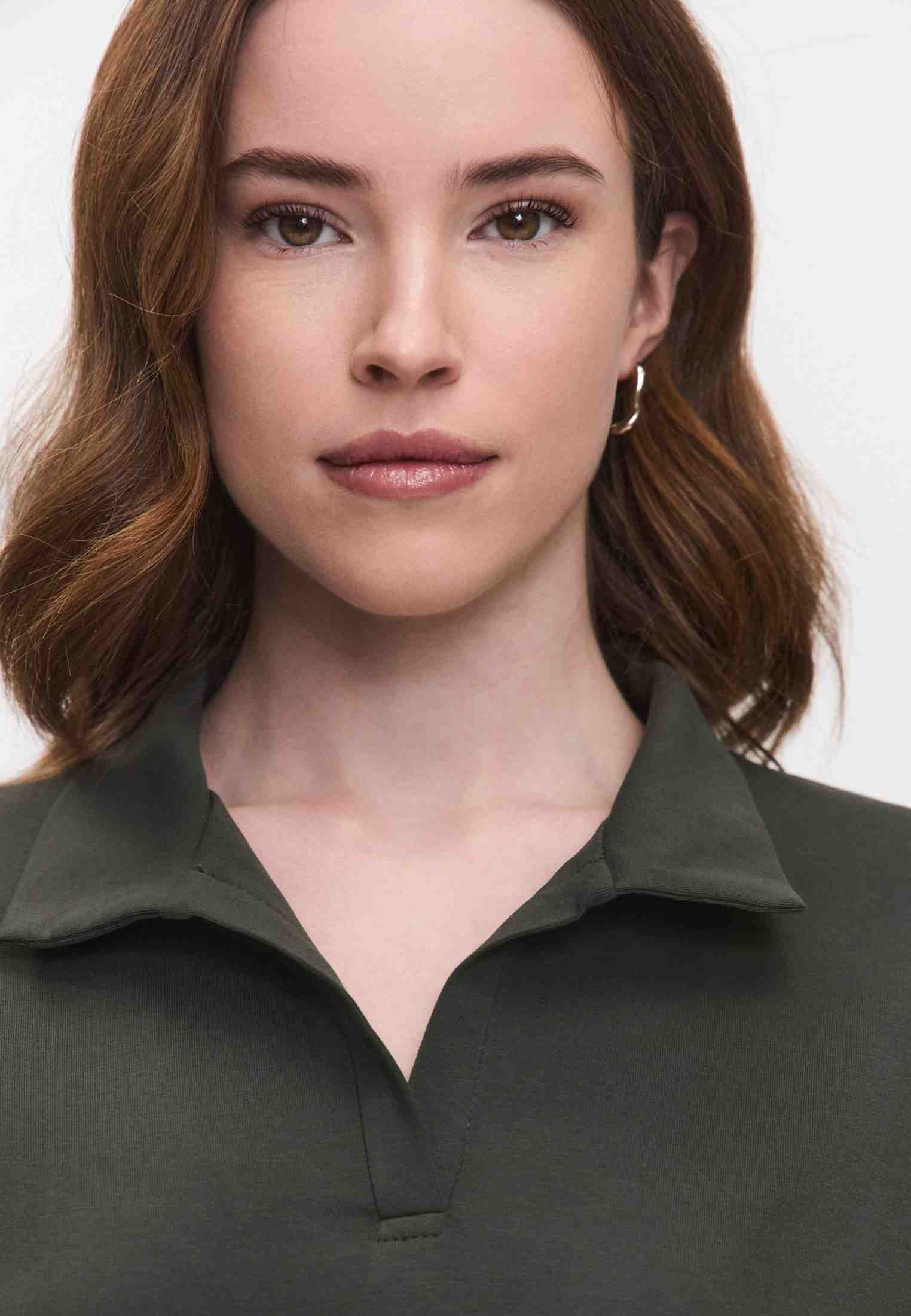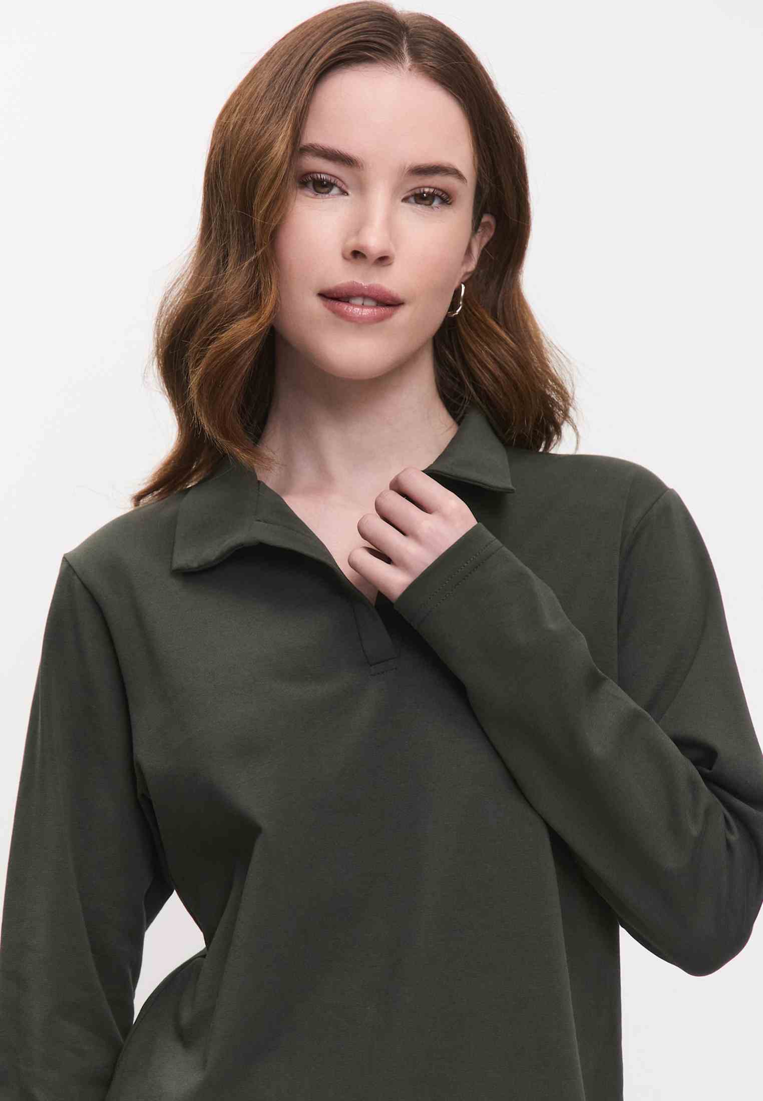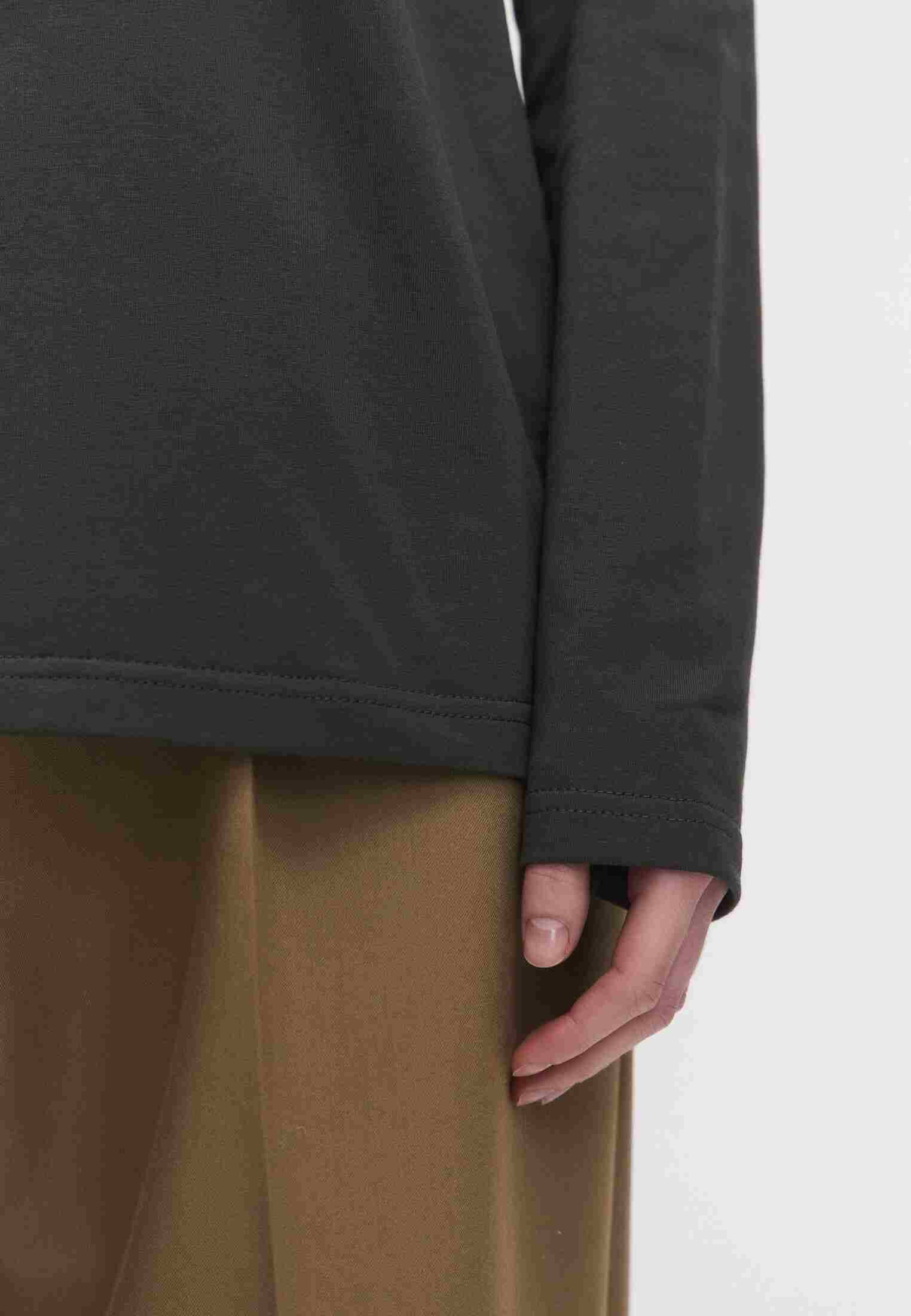 Лонгслив-поло из кулирки, с воротником и планками, с втачным рукавом. Горловина обработана с помощь киперной ленты. Низ лонгслива и низ рукава обработаны на плоскошовной м-не.