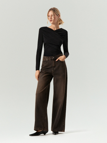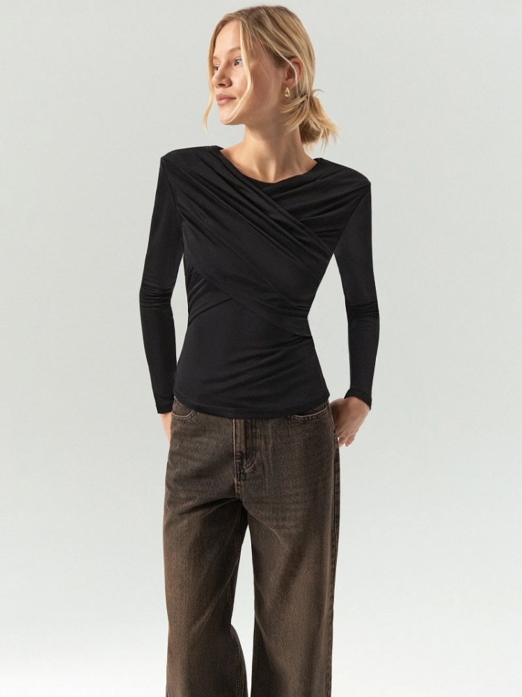Роскошный полуприлегающий лонгслив с драпировкой и подплечниками. Драпировка не только делает образ эффектнее, но и даёт ещё более красивую посадку. Подплечники создают форму, структурируют верхнюю часть силуэта: такой трикотаж смотрится дорого. Качественный материал из вискозы приятен к телу. Базовый чёрный цвет делает вещь универсальной. Лонгслив станет удачным решением как для повседневных, так и для коктейльных или вечерних образов. Идеально сочетается со стильными брюками модных фасонов и простым денимом. Модель маломерит на один размер