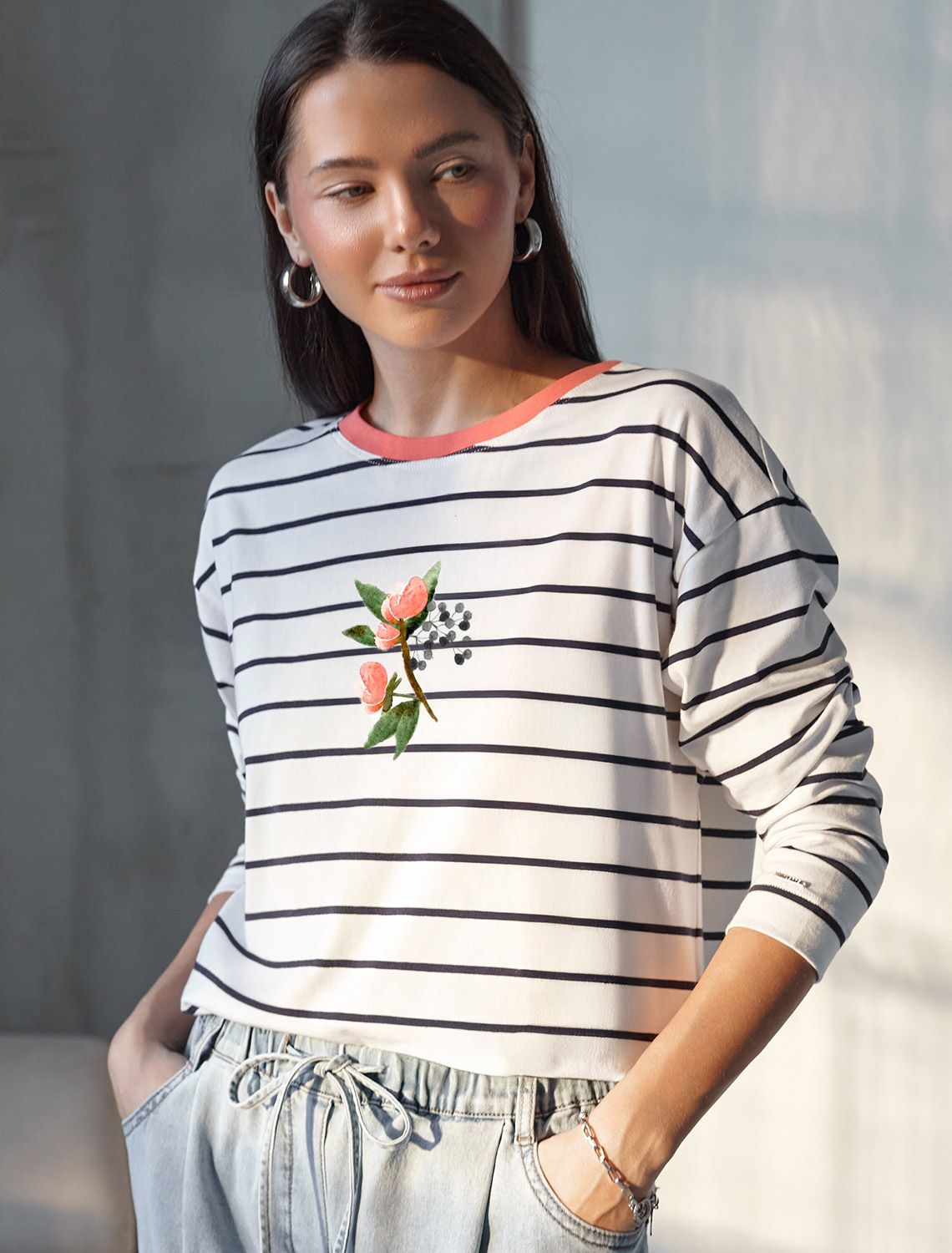 Свободный лонгслив белого цвета в темно-синюю полоску с длинным рукавом выполнен из премиального хлопка с добавлением эластана, плотностью 170 Г/м2, что обеспечивает комфорт и приятные тактильные ощущения. Полоска - придает изделию легкую текстурность, принт в виде цветка, который нанесен красками с устойчивым покрытием, добавляет стиля и индивидуальности, а круглый ворот создает универсальный образ, который подойдет для повседневного использования. Такой лонгслив идеально подходит для весеннего и летнего сезона благодаря легкой и дышащей ткани. Представленная широкая размерная линейка позволяет выбрать оптимальный вариант на любую фигуру, в том числе на плюс-сайз, обеспечивая свободу движений и удобство на каждый день. Этот комфортный лонгслив станет отличной базой в гардеробе, сочетаясь с различными стилями одежды и создавая простой, но эффектный образ.