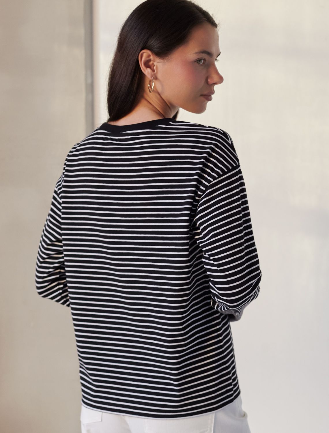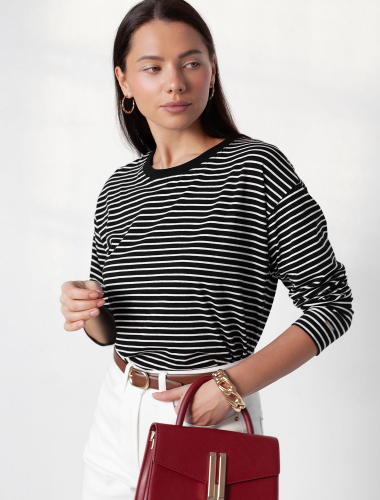 Свободный лонгслив в черно-белую полоску с длинным рукавом выполнен из премиального хлопка с добавлением эластана, плотностью 170 Г/м2, что обеспечивает комфорт и приятные тактильные ощущения. Полоска - придает изделию легкую текстурность и стильный вид, а круглый ворот создает универсальный образ, который подойдет для повседневного использования. Такой лонгслив идеально подходит для весеннего и летнего сезона благодаря легкой и дышащей ткани. Представленная широкая размерная линейка позволяет выбрать оптимальный вариант на любую фигуру, в том числе на плюс-сайз, обеспечивая свободу движений и удобство на каждый день. Этот комфортный лонгслив станет отличной базой в гардеробе, сочетаясь с различными стилями одежды и создавая простой, но эффектный образ.