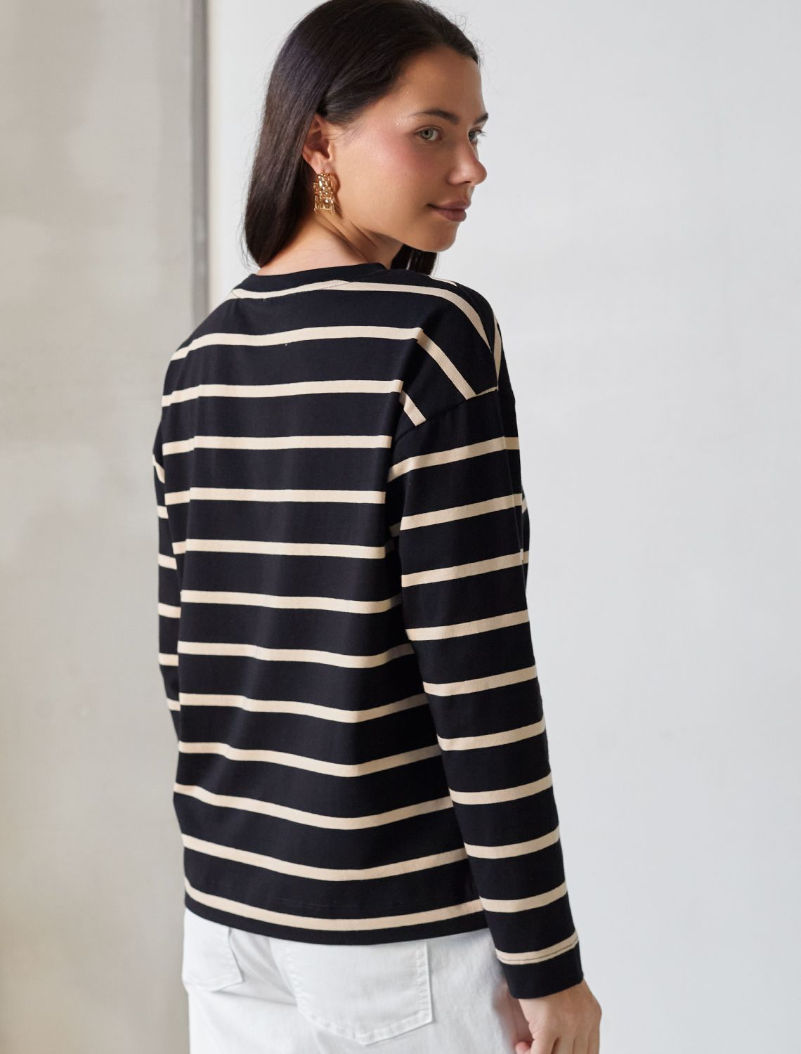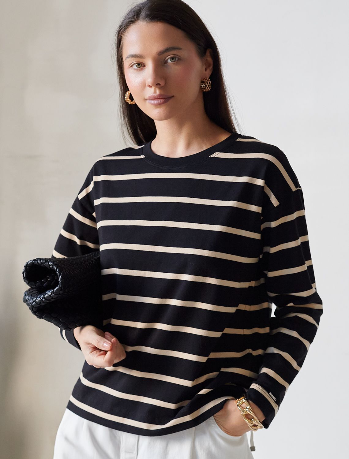 Свободный лонгслив черного цвета в бежевую полоску с длинным рукавом выполнен из премиального хлопка с добавлением эластана, плотностью 170 Г/м2, что обеспечивает комфорт и приятные тактильные ощущения. Принт полоска - придает изделию легкую текстурность и стильный вид, а круглый ворот создает универсальный образ, который подойдет для повседневного использования. Такой лонгслив идеально подходит для весеннего и летнего сезона благодаря легкой и дышащей ткани. Представленная широкая размерная линейка позволяет выбрать оптимальный вариант на любую фигуру, в том числе на плюс-сайз, обеспечивая свободу движений и удобство на каждый день. Этот комфортный лонгслив станет отличной базой в гардеробе, сочетаясь с различными стилями одежды и создавая простой, но эффектный образ.