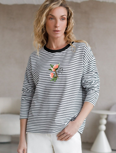 Свободный лонгслив в черно-белую полоску с длинным рукавом выполнен из премиального хлопка с добавлением эластана, плотностью 170 Г/м2, что обеспечивает комфорт и приятные тактильные ощущения. Полоска - придает изделию легкую текстурность, принт в виде цветка, который нанесен красками с устойчивым покрытием, добавляет стиля и индивидуальности, а круглый ворот создает универсальный образ, который подойдет для повседневного использования. Такой лонгслив идеально подходит для весеннего и летнего сезона благодаря легкой и дышащей ткани. Представленная широкая размерная линейка позволяет выбрать оптимальный вариант на любую фигуру, в том числе на плюс-сайз, обеспечивая свободу движений и удобство на каждый день. Этот комфортный лонгслив станет отличной базой в гардеробе, сочетаясь с различными стилями одежды и создавая простой, но эффектный образ.