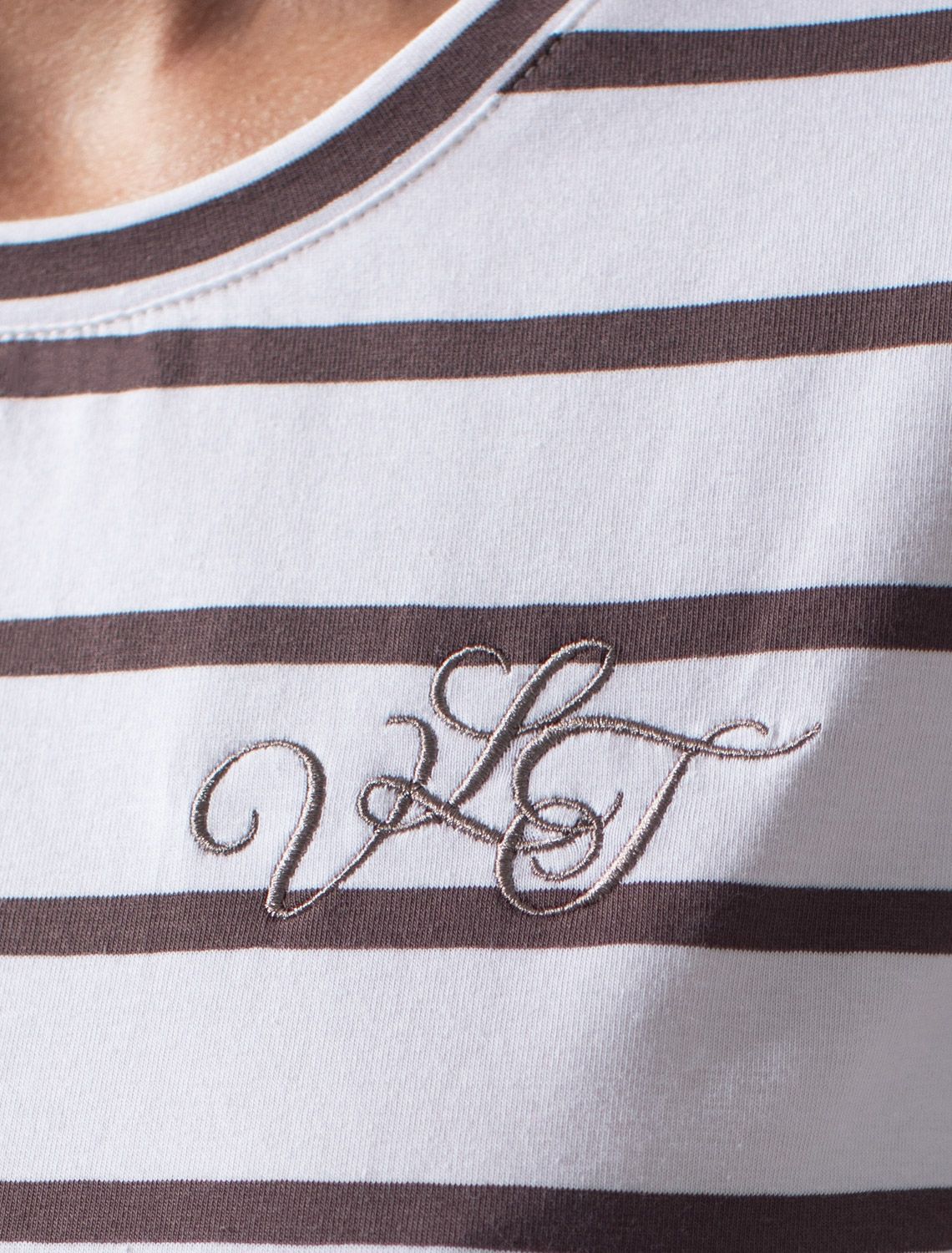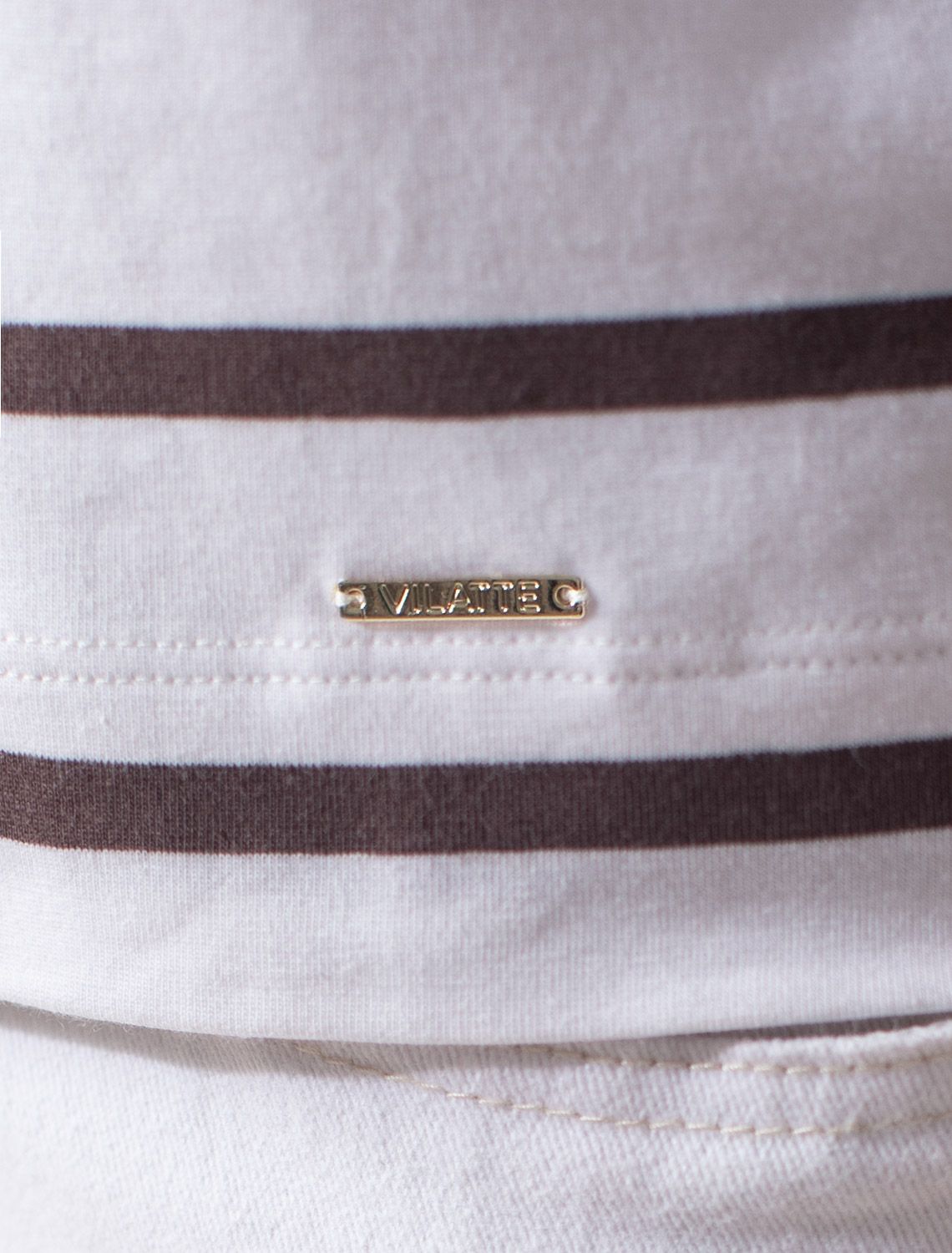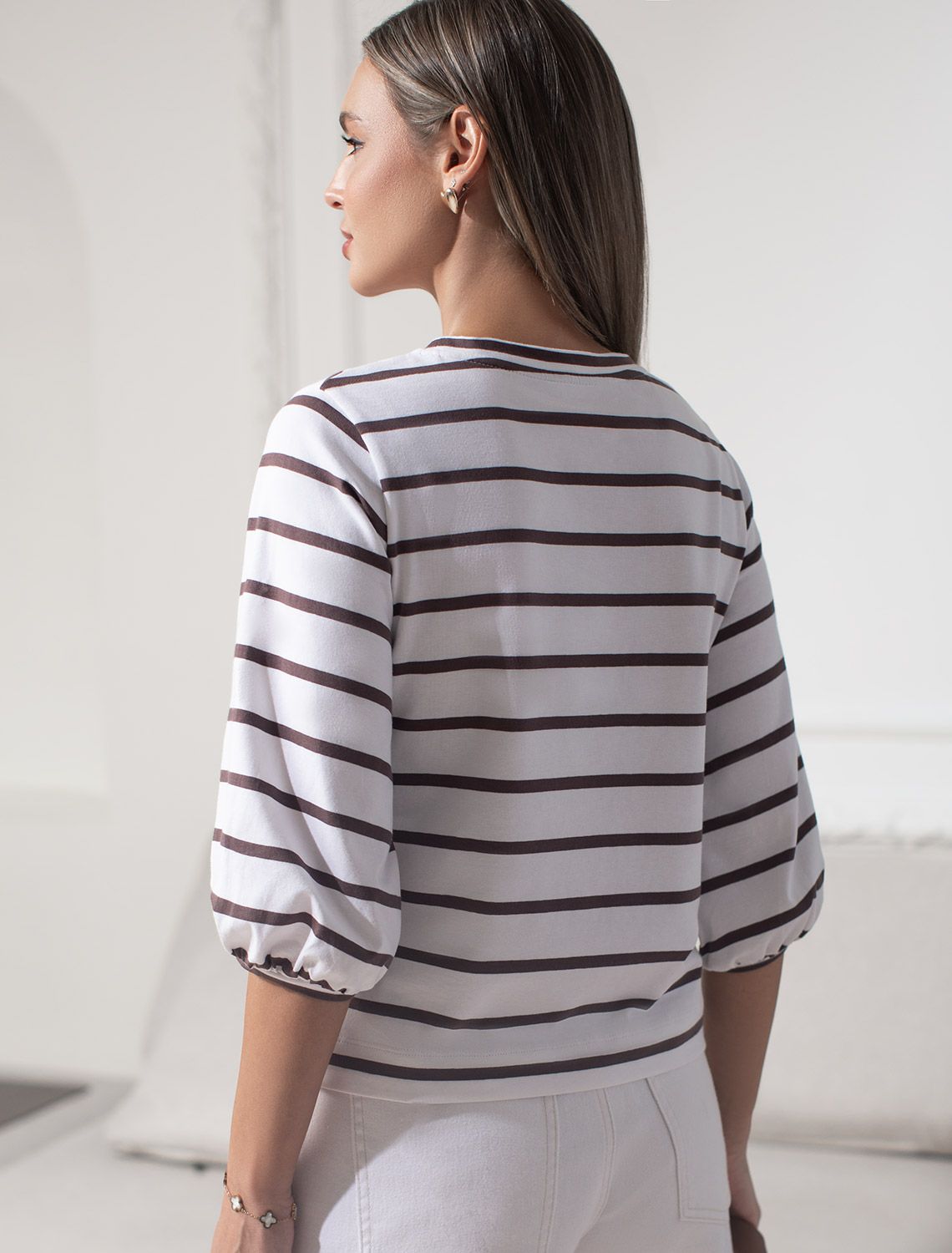 Свободный лонгслив белого цвета в кофейную полоску с рукавом средней длины выполнен из премиального хлопка с добавлением эластана, плотностью 170 Г/м2, что обеспечивает комфорт и приятные тактильные ощущения. Полоска - придает изделию легкую текстурность, аккуратная вышивка в виде букв логотипа бренда добавляет стиля и индивидуальности, а круглый ворот создает универсальный образ, который подойдет для повседневного использования. Объемные рукава буфы средней длины делают этот лонгсив женственным и изящным.Такой лонгслив идеально подходит для весеннего и летнего сезона благодаря легкой и дышащей ткани. Представленная широкая размерная линейка позволяет выбрать оптимальный вариант на любую фигуру, в том числе на плюс-сайз, обеспечивая свободу движений и удобство на каждый день. Этот комфортный лонгслив станет отличной базой в гардеробе, сочетаясь с различными стилями одежды и создавая простой, но эффектный образ.