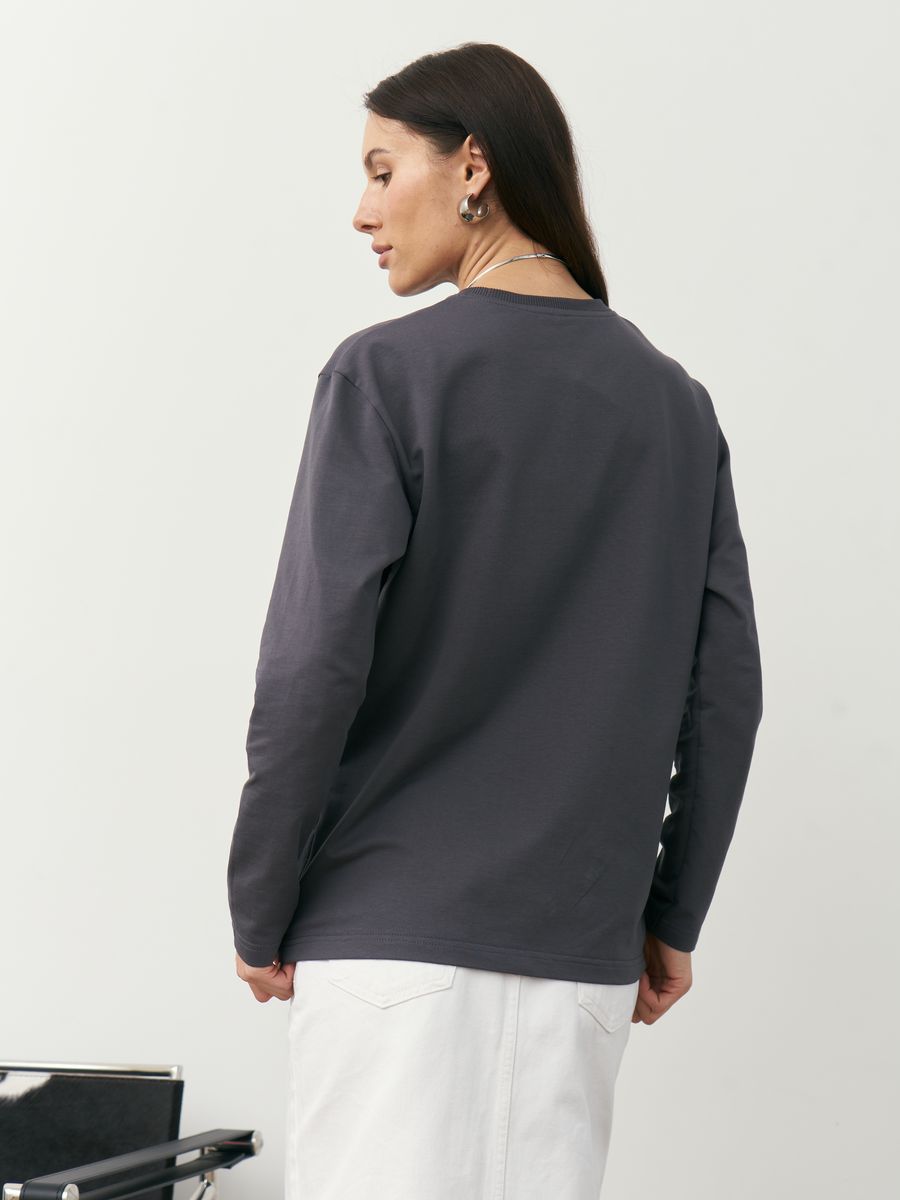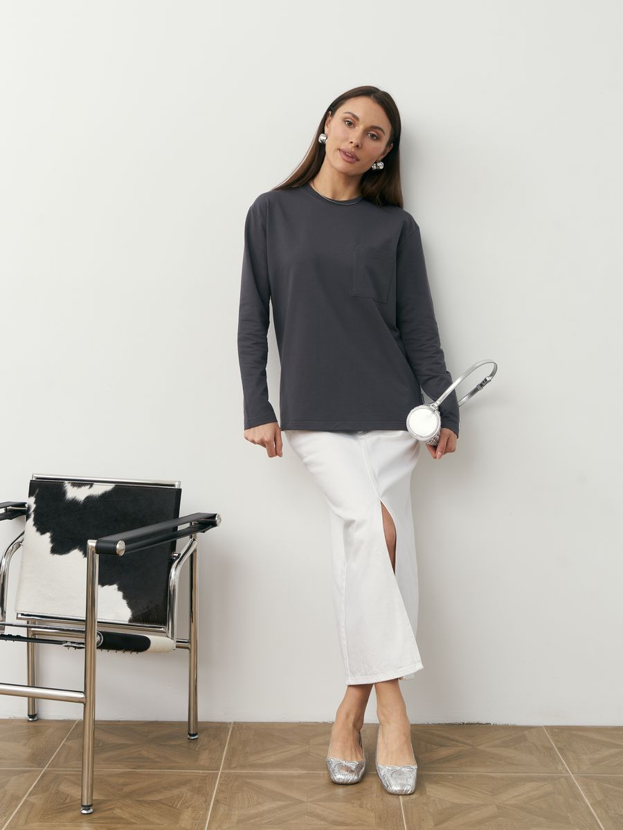 Женский лонгслив из футера 2-х нитка петля, с втачным рукавом. На полочке нагрудный накладной карман. Горловина обработана бейкой из кашкорсе. Низ лонгслива и низ рукава подвернуты и подшиты.