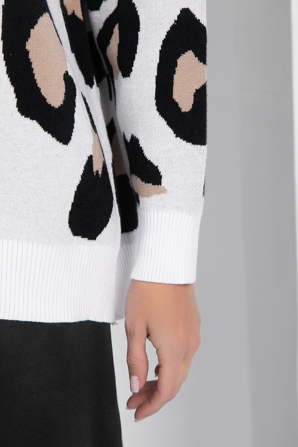 Джемпер прямого кроя с длинными рукавами — воплощение комфорта и тепла. Он мягкий и приятный на ощупь, что делает его идеальным выбором для повседневной носки. Свободный крой и спущенная линия плеча создают ощущение простора и свободы движений. Вы будете чувствовать себя комфортно в любой ситуации. Высокий ворот-хомут не только добавляет стильный акцент, но и надёжно защищает от холода. Леопардовый принт придаёт дерзости и оригинальности. Наденьте этот джемпер и наслаждайтесь его уютом!