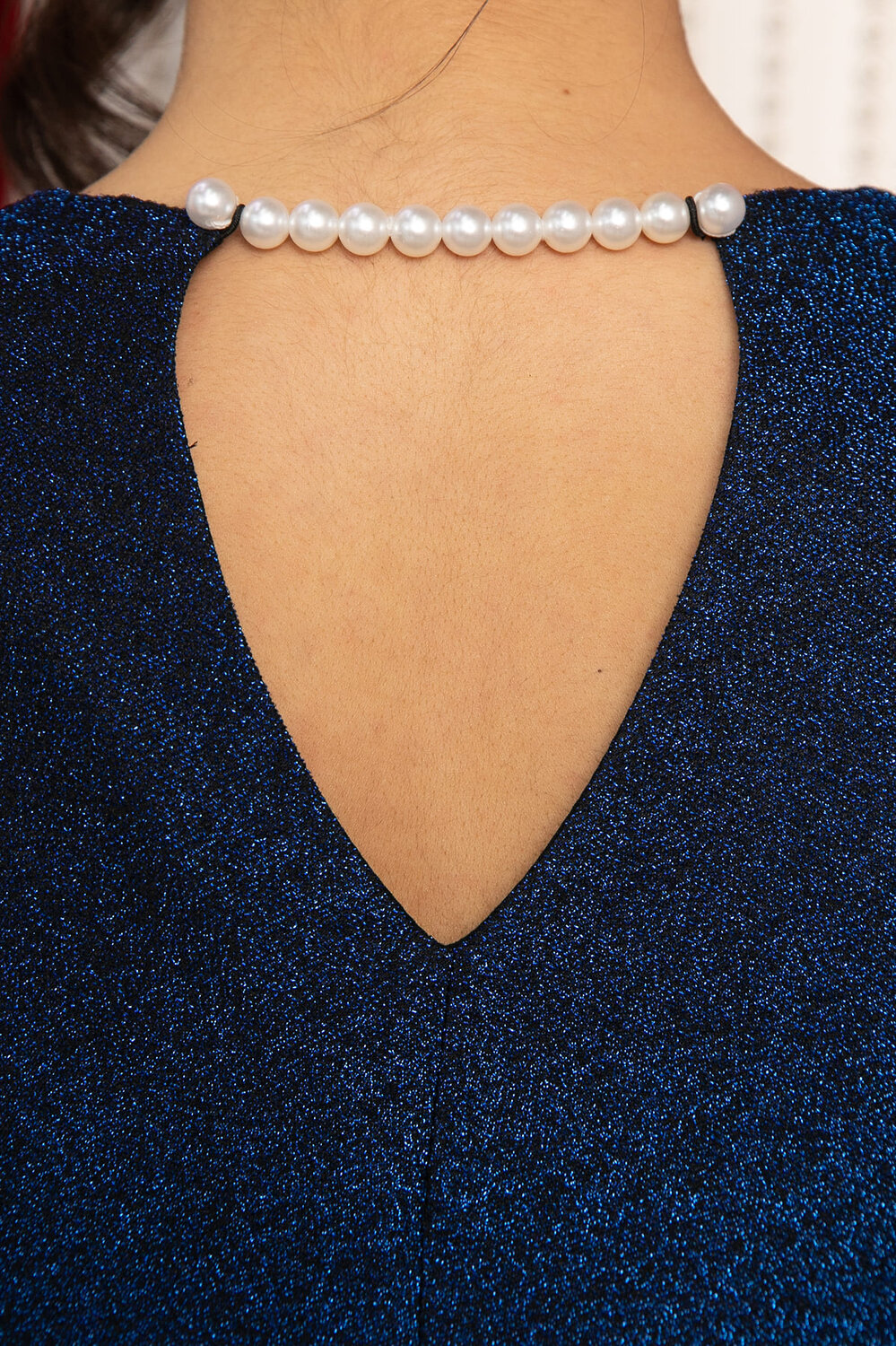 Вечернее платье средней длины полуприлегающего силуэта из трикотажа с люрексом станет вашим идеальным выбором! Декоративный вырез на спинке с перемычкой из «жемчужной» нити — изюминка платья. Втачной рукав-полуреглан плавно подчёркивает линию вашего плеча. Разрез по низу спинки обеспечивает комфорт при движении и придаёт платью особый шарм. Платье идеально садится по фигуре, подчёркивая достоинства.