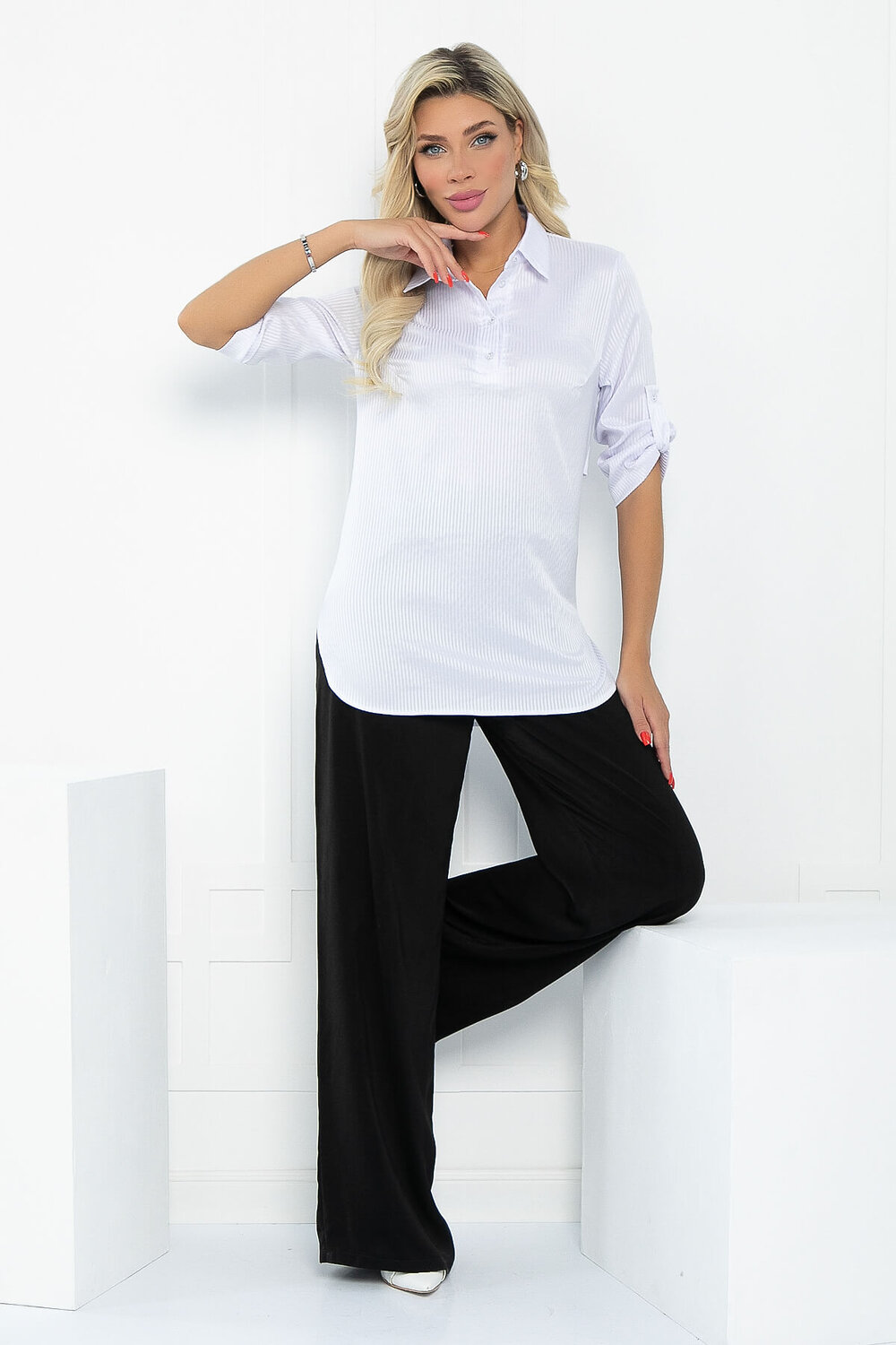 Изящная блузка с рубашечным воротником станет отличным выбором для создания стильного образа в офисе, на учёбе или в повседневной жизни. Модель оснащена застёжкой на четыре пуговицы, что придаёт ей утончённый и элегантный вид. Удобные рукава можно укоротить с помощью пат, что позволяет адаптировать блузку под любой стиль. На спинке предусмотрена заниженная кокетка, а низ с закруглёнными углами придаёт ей особую изюминку.