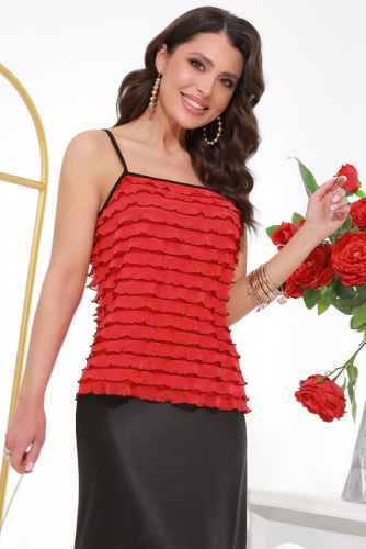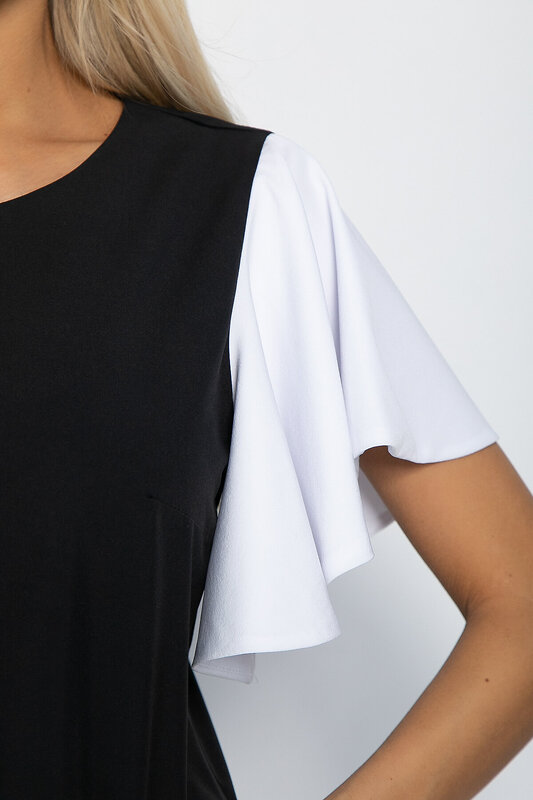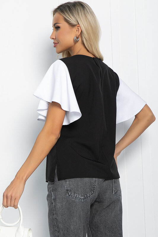 Стильная блузка с разрезами по бокам – это универсальная вещь Вашего гардероба, носите ее с брюками, юбкой, джинсами. Имеет округлый вырез горловины, эффектные рукава-воланы. Вы будете определенно в центре внимания, сочетая эту блузку с более деловым стилем в одежде, ощущайте себя уверенно и комфортно на любом официальном мероприятии.