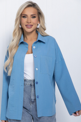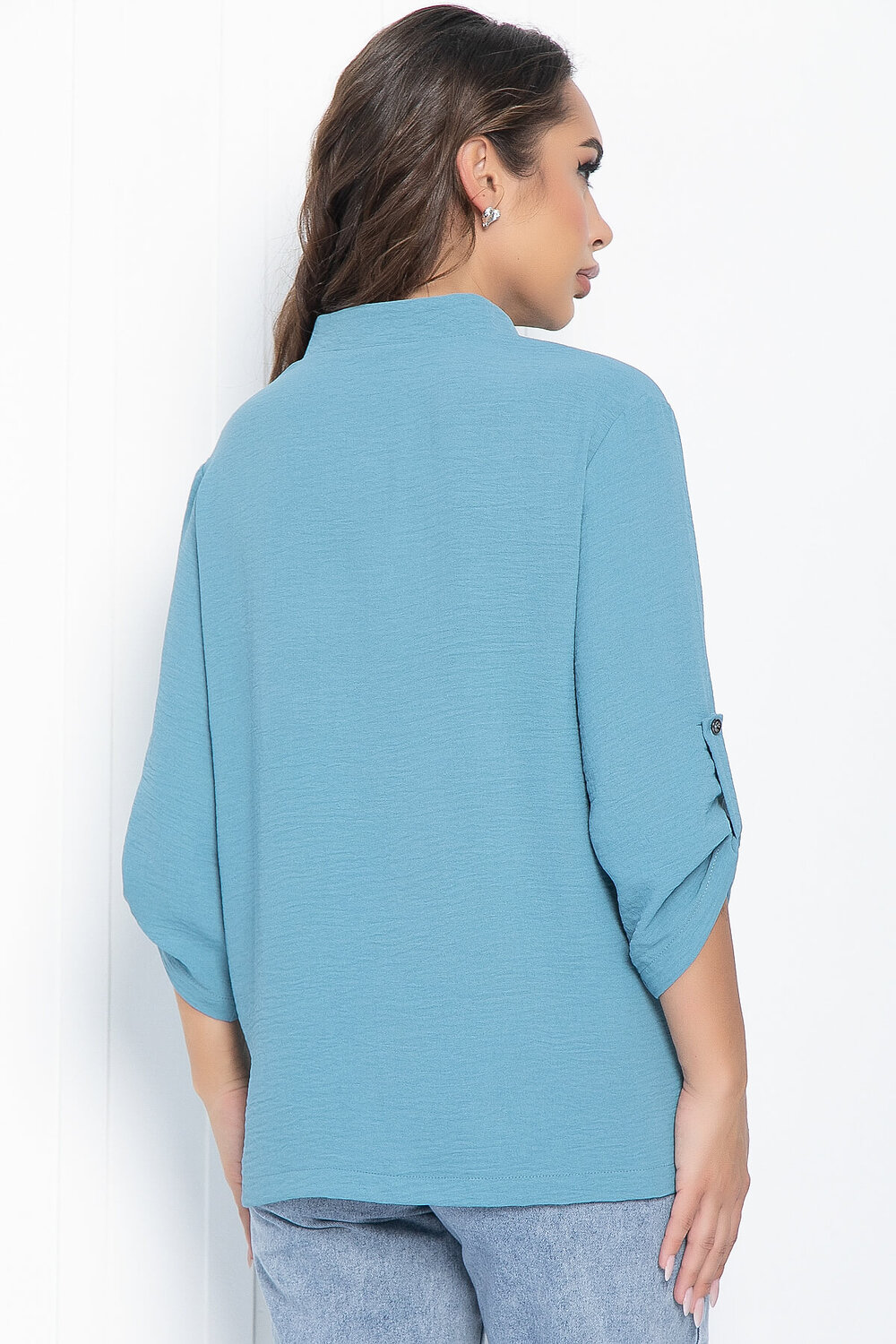 Лёгкая блуза свободного кроя в красивом цвете морской волны. Классический воротник-стойка, рукав три четверти, на пате. По бокам есть разрезы. Такая блуза подойдёт для создания офисного образа, а также её можно использовать в повседневных ансамблях.