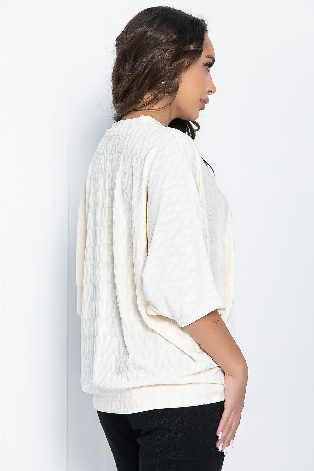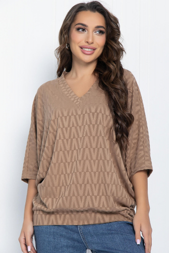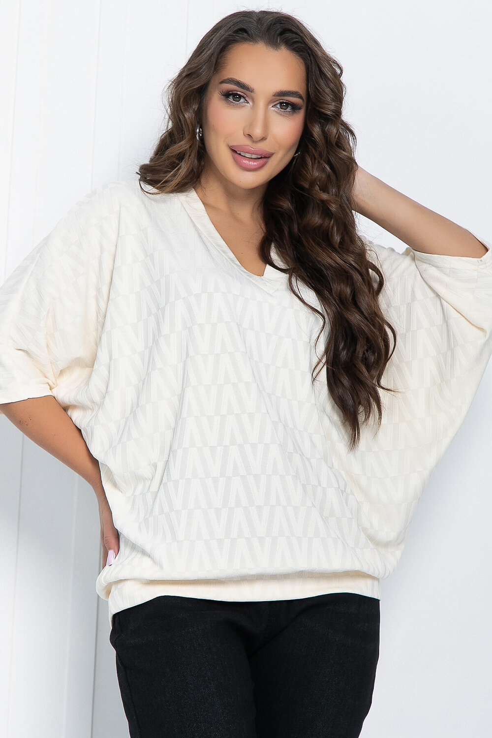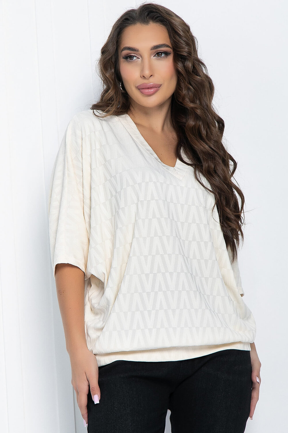 Блуза имеет интересный дизайн с V-образным вырезом горловины и удобным цельнокроеным рукавом «летучая мышь» длины ¾ . Важное преимущество такого рукава заключается в его способности скрывать различные погрешности фигуры. Обладая женственной привлекательностью, подойдет к классической офисной и к деловой повседневной одежде.