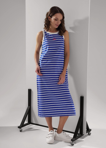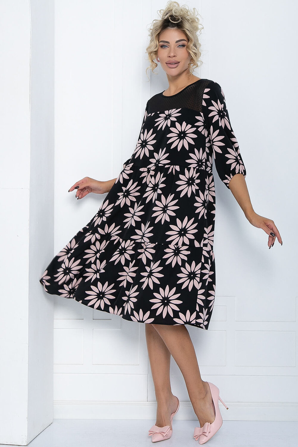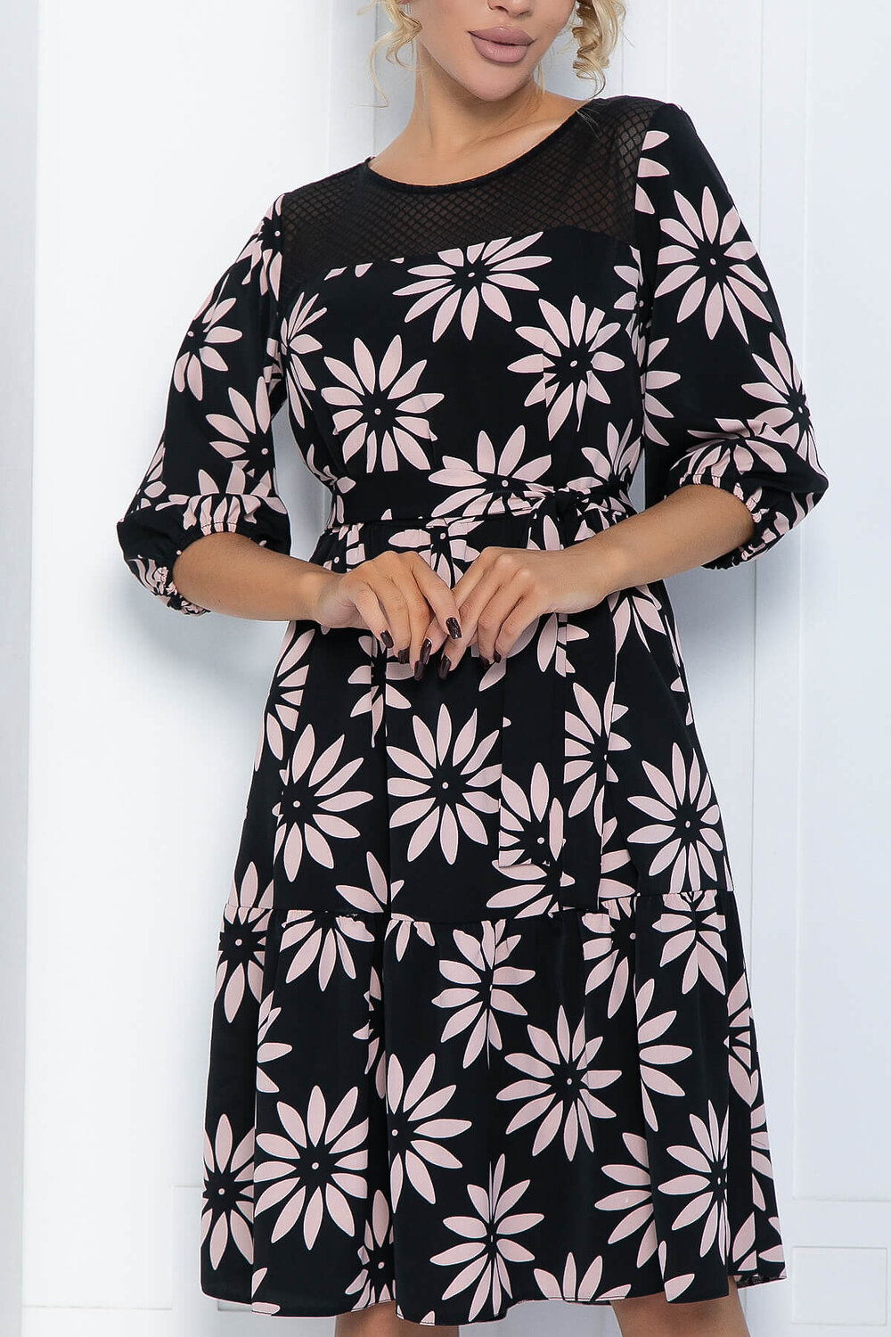 Платье свободного кроя, которое сочетает в себе воздушную лёгкость и элегантность. Верхнюю часть платья украшает вставка из кружева. Юбка состоит из широких воланов. В комплект входит пояс из основной ткани.