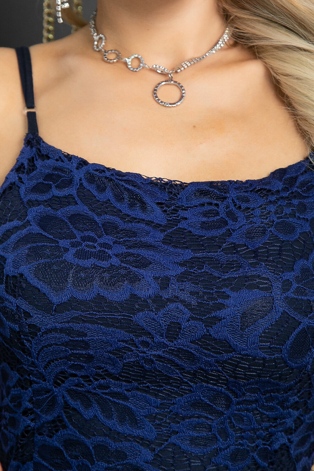 Облегающее кружевное платье средней длины — идеальное решение для особых случаев и торжественных мероприятий. Благодаря регулируемым бретелям, вы сможете легко настроить его под свой комфорт и добиться идеальной посадки. Модель имеет рельефные элементы как спереди, так и сзади.