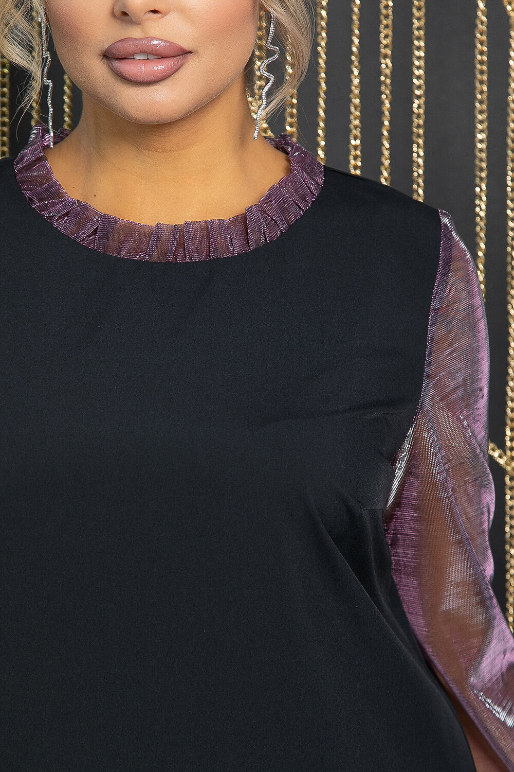 Эффектное платье свободного кроя, создающее неповторимый образ, который будет уместен как для повседневной носки, так и для торжественных мероприятий. Этот наряд подчеркнет вашу индивидуальность и придаст уверенности в себе. Платье отличается акцентным рукавом на манжете и рюшами по горловине. Рукава выполнены из сетчатой ткани с блеском, что придает платью особую привлекательность.