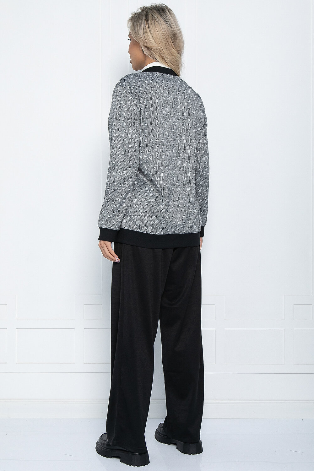 Костюм-двойка, состоящий из классических брюк прямого кроя и свободного жакета с трендовым принтом. Брюки на молнии спереди, сзади талия на резинке, в боковых швах есть карманы. В таком трикотажном костюме можно смело отправиться на прогулку или на встречу с друзьями. Целый день вам будет уютно и комфортно.