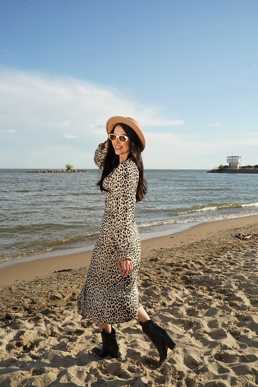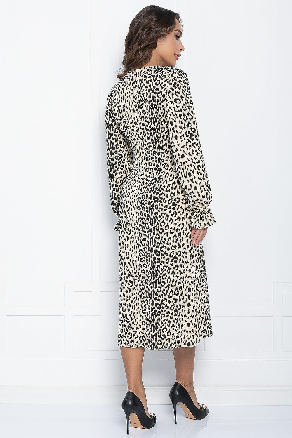 Элегантное платье в леопардовом принте обладает уникальным приталенным кроем с эффектным разрезом и изысканными оборками на рукавах. С таким платьем легко удастся создать как нарядные, так и повседневные образы. Оно отрезное по талии, юбка слегка расширена к низу. Спереди юбка украшена застежкой на пуговицы.