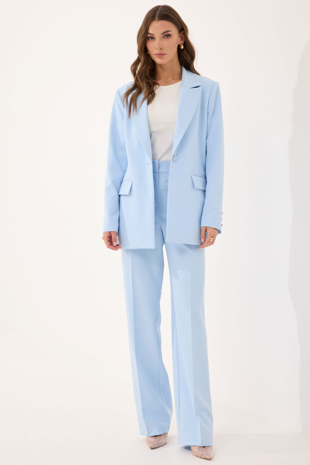 Брюки прямого силуэта из костюмной ткани. По верху брюк притачной пояс с застежкой на крючок и декоративные протяжки.  На передних половинках обработаны карманы и застежка молния в среднем шве.  На задних половинках вытачки. По поясу задних половинок брюк резинка. Обращаем ваше внимание, что фурнитура может незначительно отличаться от фото.