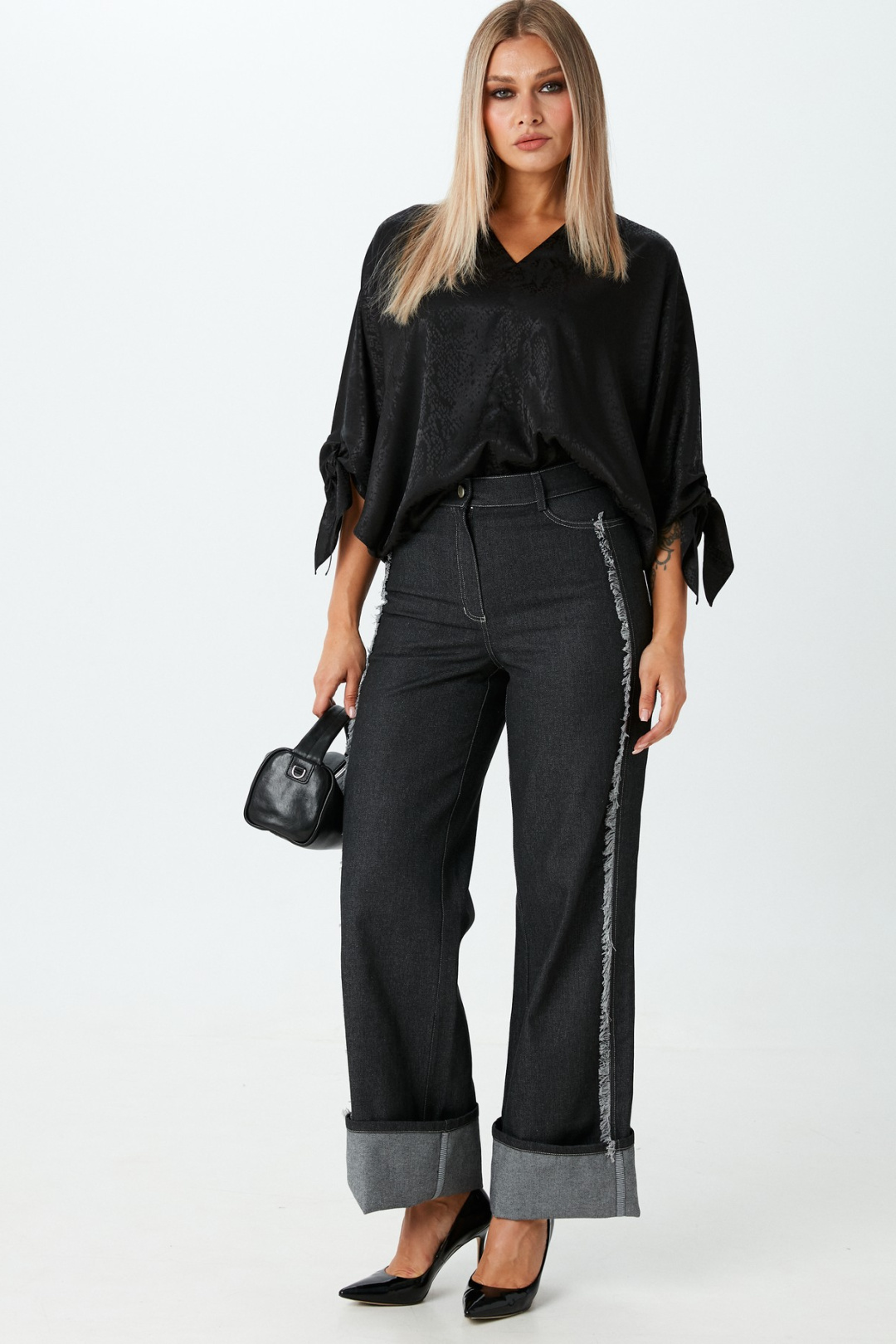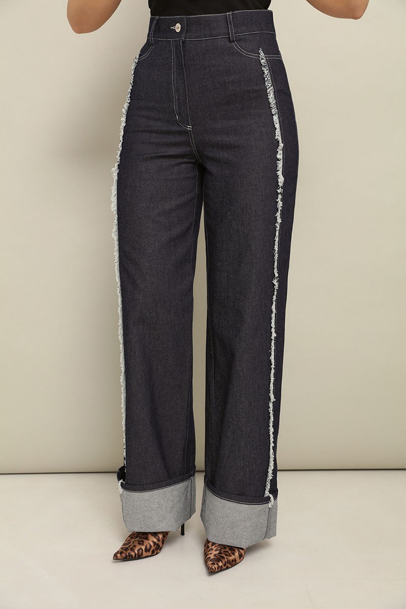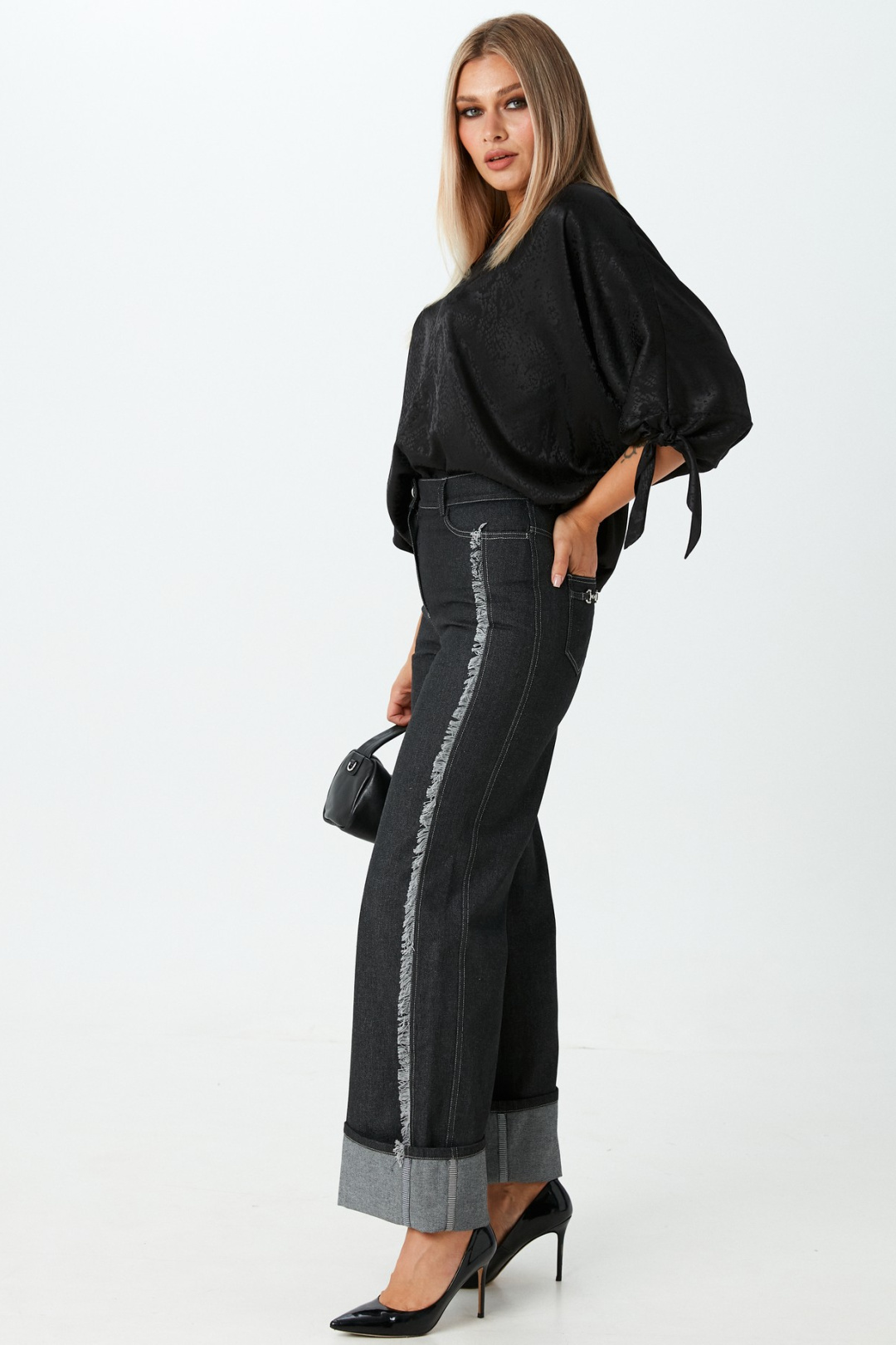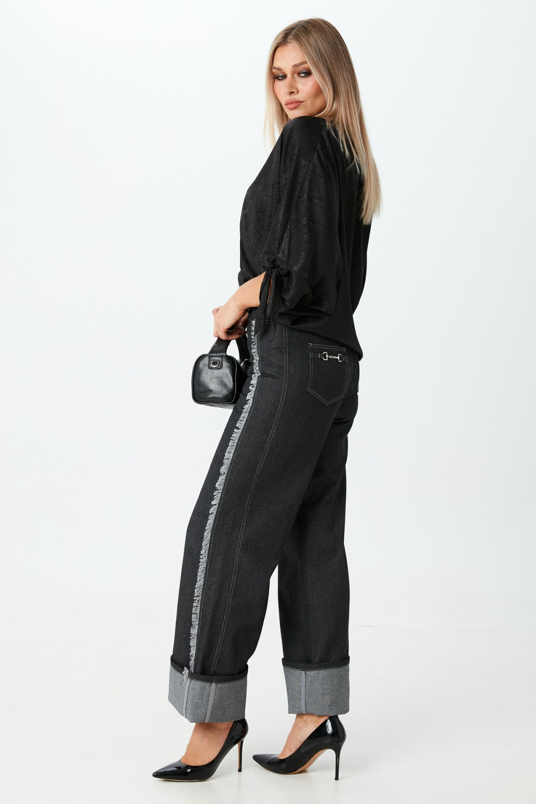 Комфортные плотные брюки из джинсовой ткани свободнго объёма от бедра с подворотами по низу, которые позволяют регулировать длину брюк.