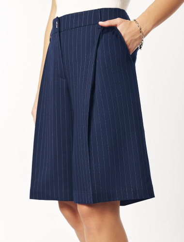Шорты-бермуды выполнены из костюмной ткани в полоску. Модель свободного кроя дополнена боковыми и задними карманами. Изделие не сковывает движений и подходит для любого типа фигуры. Сочетается в костюме с жилетом D27.001