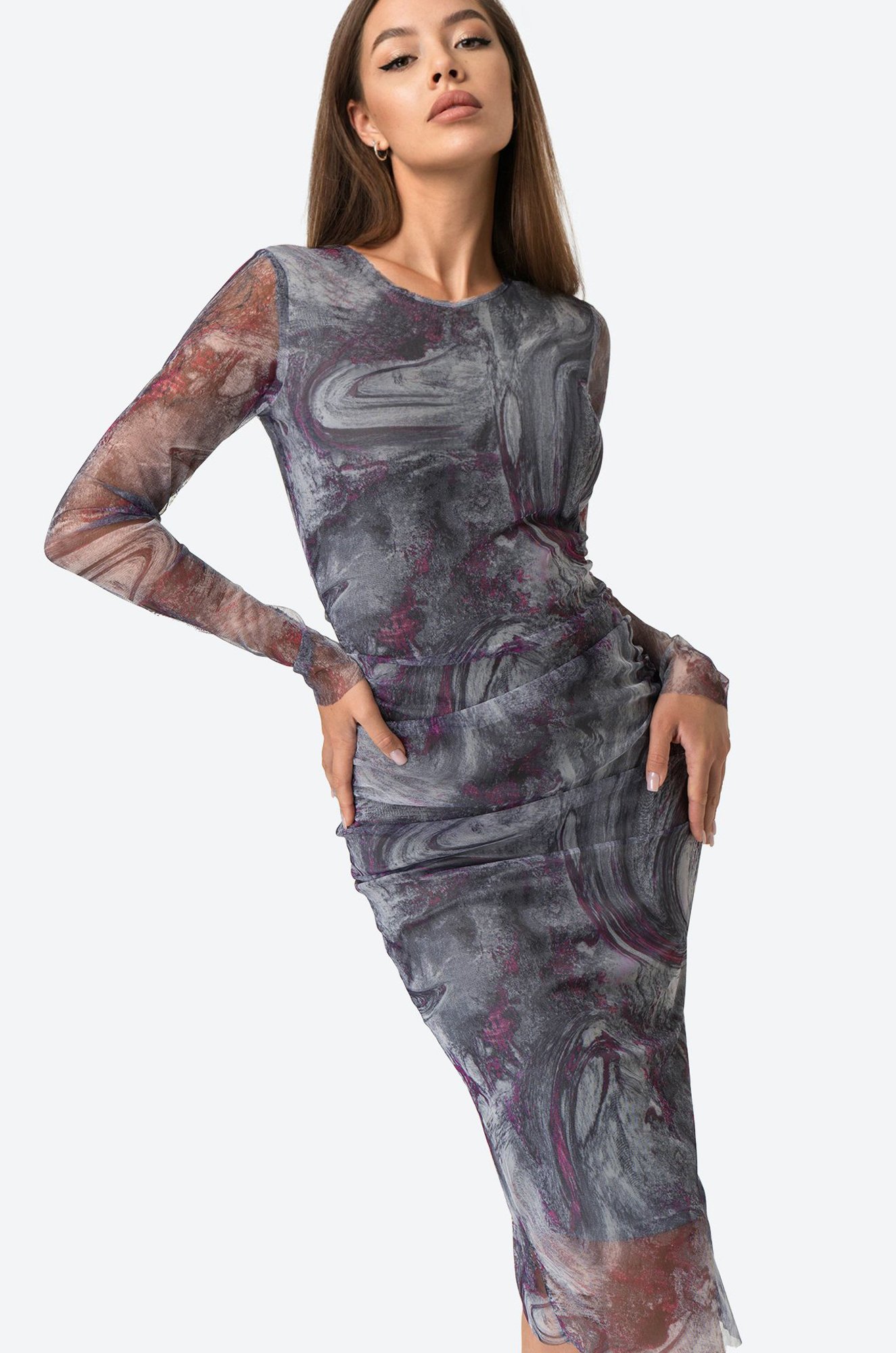 Женское платье выполнено из прочной сетки с добавлением вискозы с эластаном. Мраморный принт и прозрачные рукава с прорезями для большого пальца придают особую привлекательность и шарм.