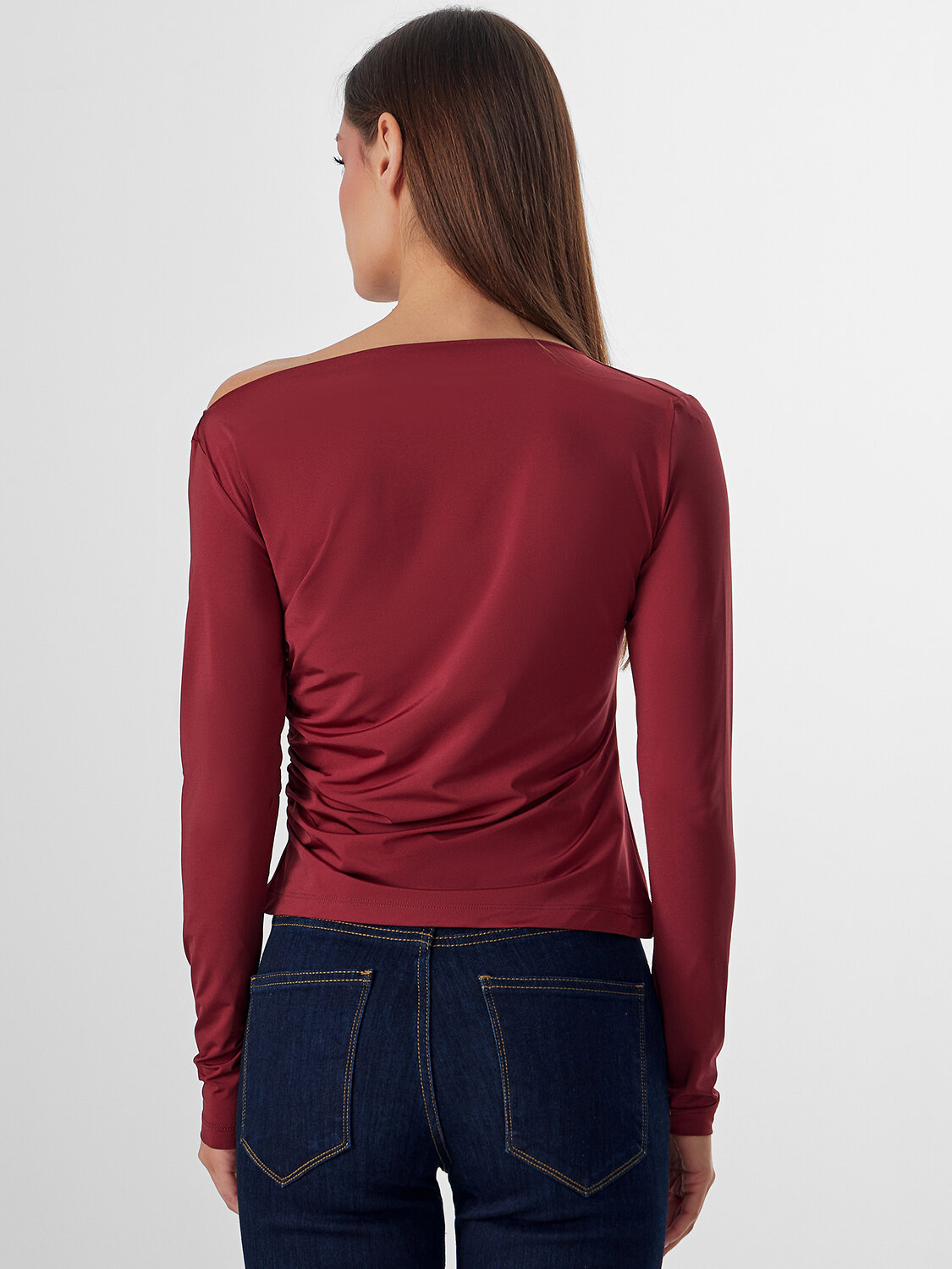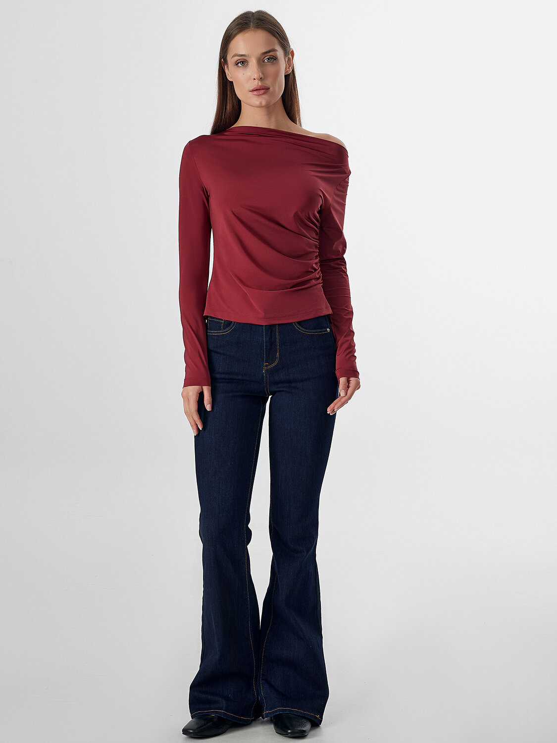 Джемпер прилегающего силуэта. Перед и спинка цельнокроеные. Драпировка в боковом шве с жилкой тканой 6мм Е7112 arteks. Горловина обработана обтачкой из основного полотна. Одно плечо спущено. Низ изделия и рукавов обработаны швом вподгибу. Внутри держатели из репсовой ленты SFLR-4 5мм цв.черный (SFLR-3 5мм цв.белый по заданию).
