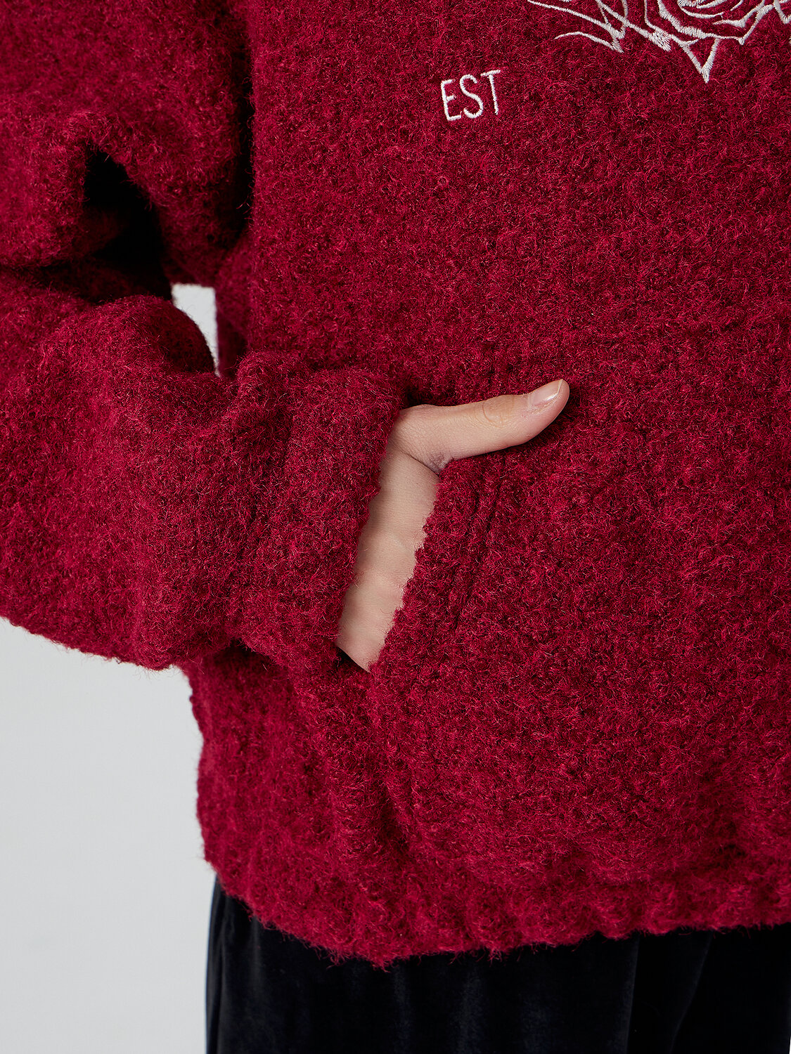Худи дополнено практичным капюшоном со шнурком-утяжкой для защиты от ветра. Спереди расположен большой накладной карман, где можно согреть руки или хранить мелочи.