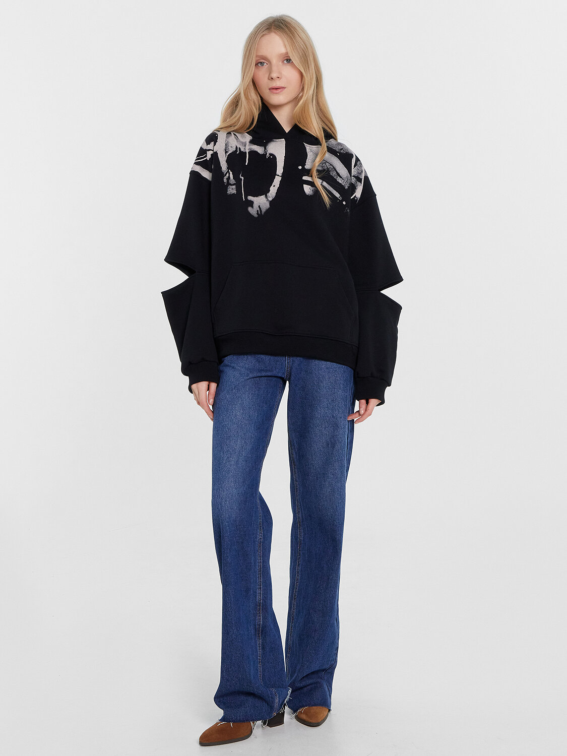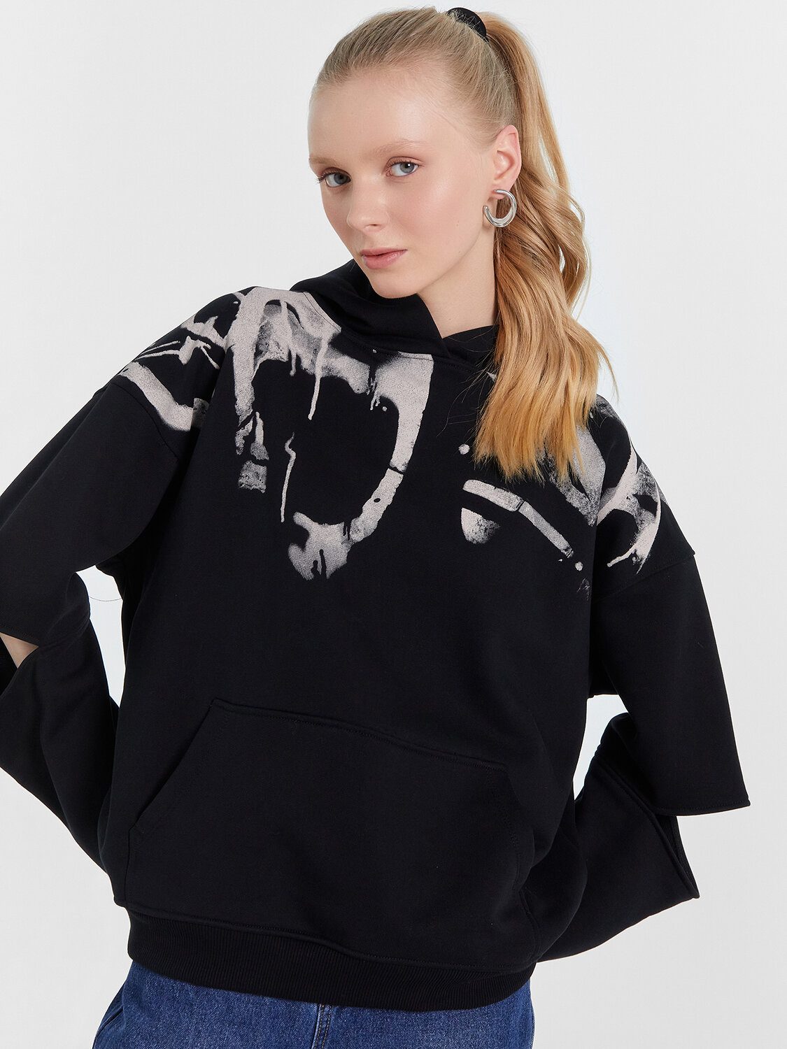 Стильное женское худи свободного силуэта - прекрасное вложение в ваш гардероб, которое станет незаменимым элементом вашего стиля. Изделие выполнено из футера - трикотажного материала с мягкой изнанкой, обеспечивающего тепло и комфорт, при этом позволяя коже дышать. Этот материал отличается своей прочностью и долговечностью, что делает его идеальным для повседневной носки. Эта стильная модель оснащена уютным капюшоном, длинными рукавами со спущенной линией плеча и эффектными разрезами на уровне локтей. Манжеты также декорированы разрезами, добавляя изюминку в общий дизайн. Спереди находится накладной карман-кенгуру, который добавляет практичности и завершает образ. Стильное и удобное худи станет вашим любимым выбором для любых повседневных образов.