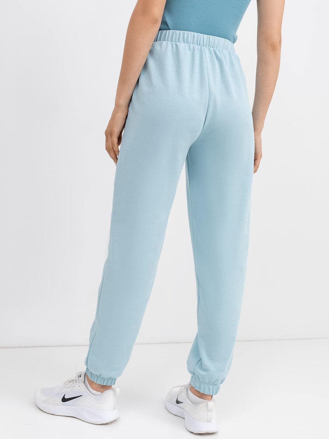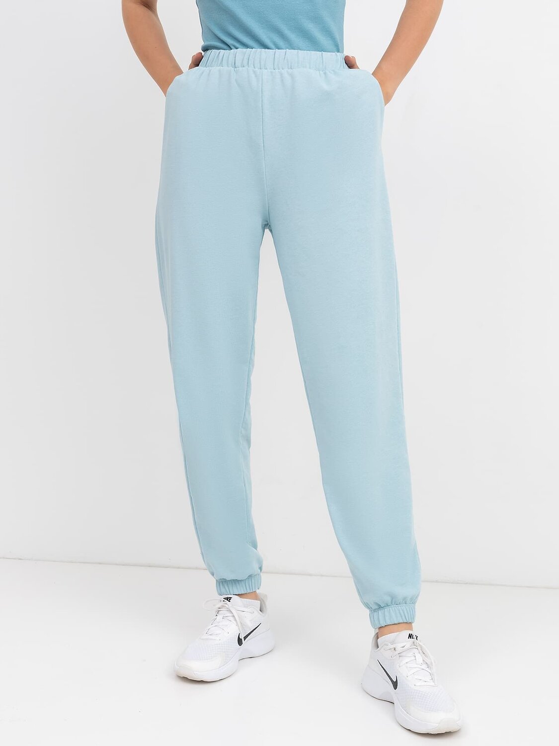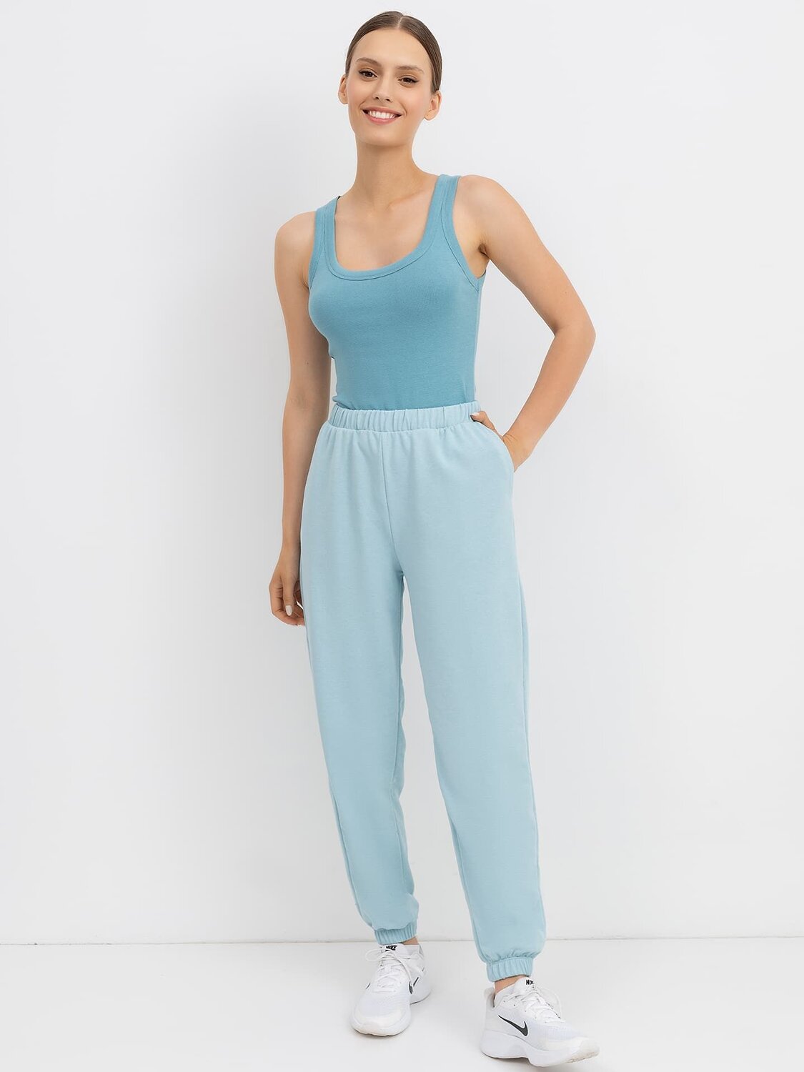 Женские джоггеры свободного силуэта из легкого трикотажного футера. Посадка на талии – высокая. Пояс с эластичной тесьмой внутри и регулировочным шнурком-завязкой. В боковых швах обработаны удобные карманы. Штанины завершаются эластичной тесьмой. Комфортные брюки!