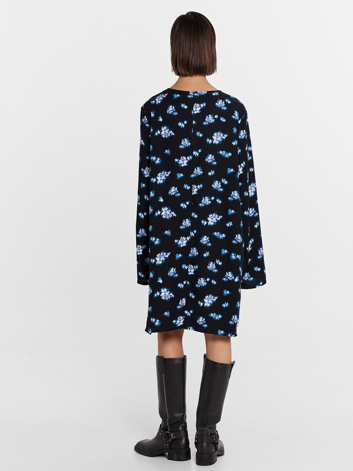 Платье прямого силуэта. Горловина круглой формы, обработано бейкой из основного полотна в "чистый край". Рукав втачной, длинный. На детали переда застрочены вытачки. Спинка со средним швом и застежкой на потайную молнию. Нижний срез платья и рукавов обработан швом вподгибку с закрытым срезом.