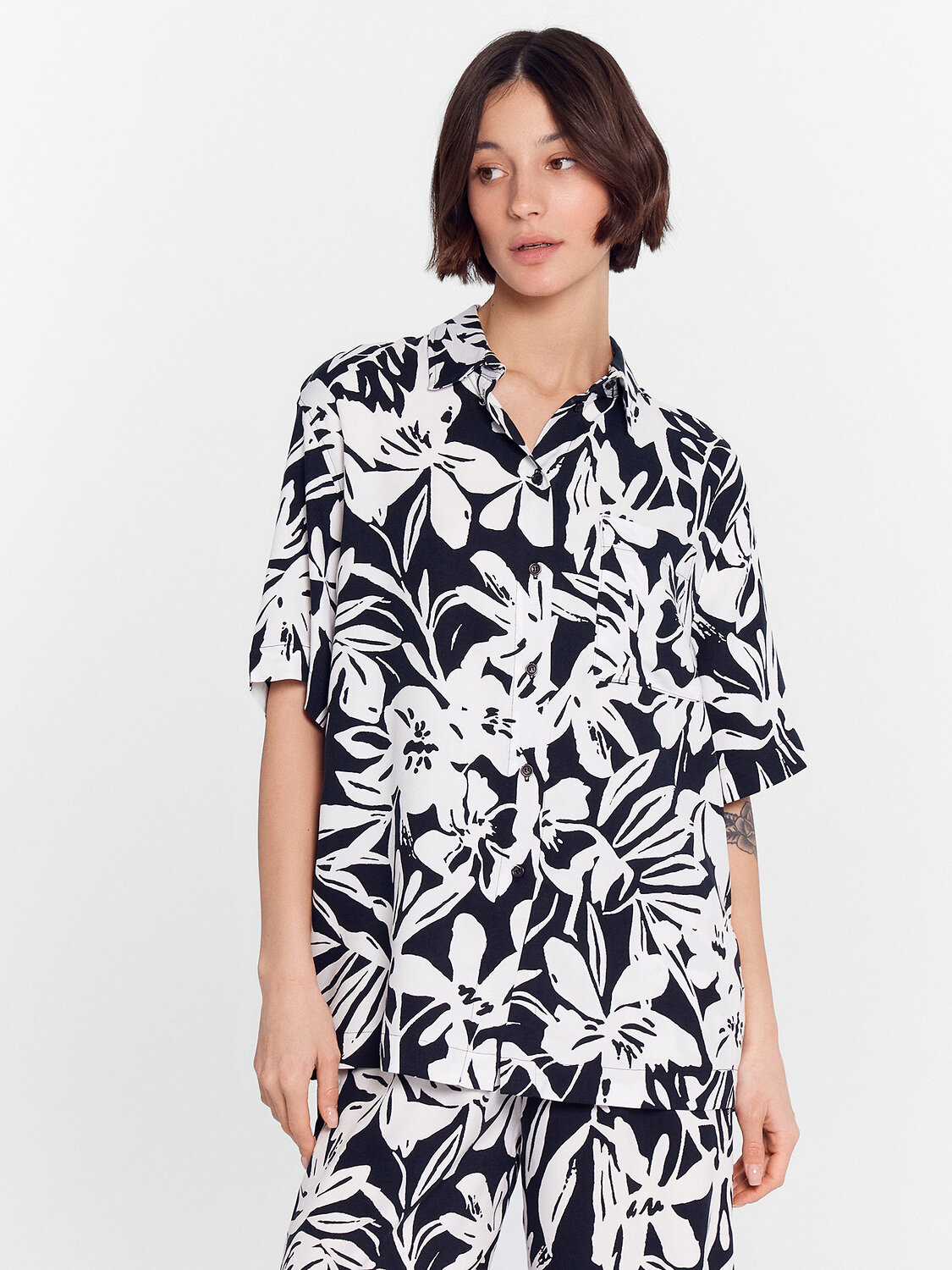 Блузка женская свободного силуэта из ткани. Блузка с цельнокроеной планкой и центральной застежкой на пуговицы. На левой детали переда накладной карман.