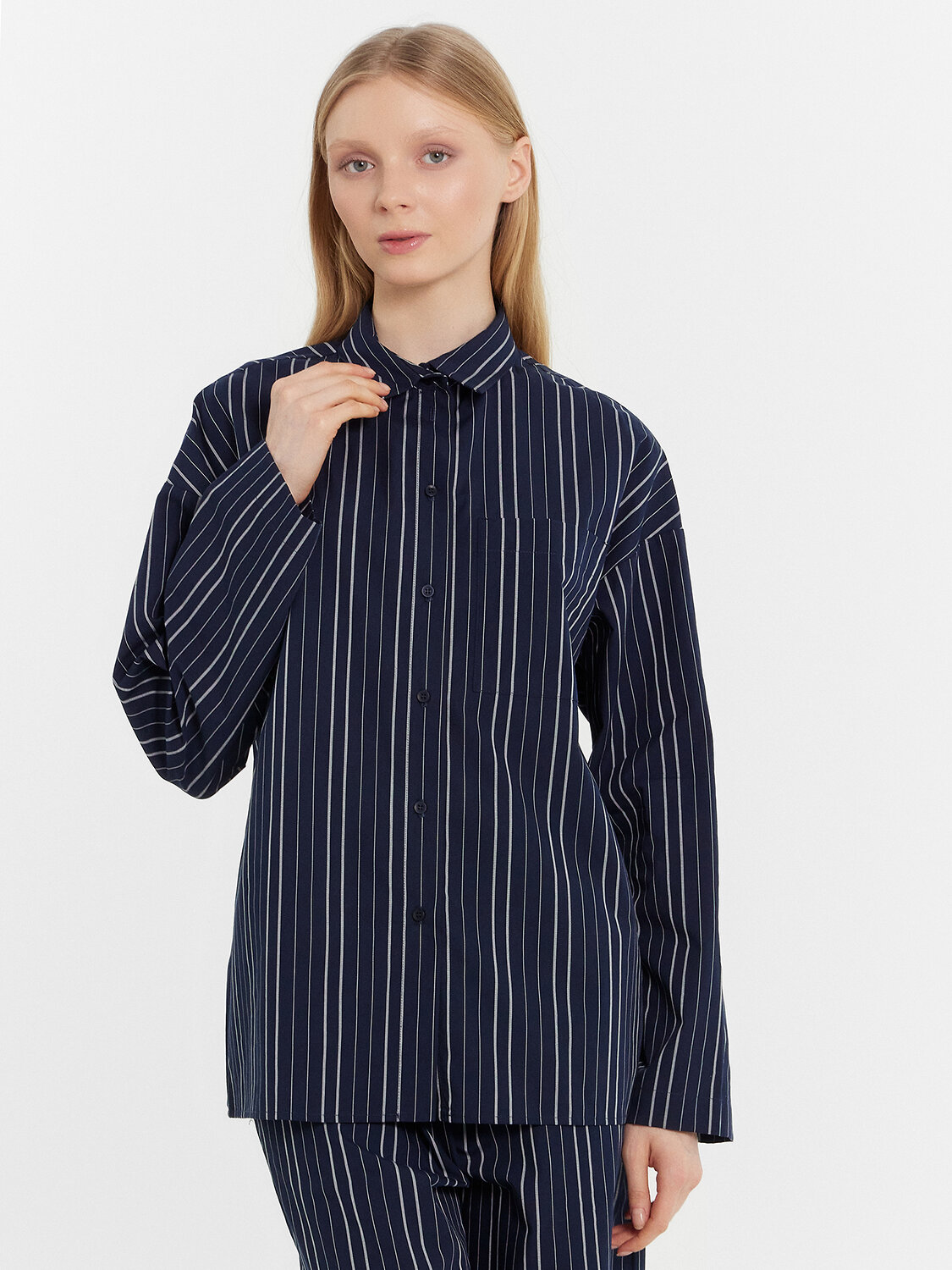 ткани. Плечо спущено, рукав втачной, длинный. По переду центральная застежка планка с пуговицами 2см. На левой передней детали накладной карман (по заданию). Низ рукава и рубашки обработан швом вподгибку. Спинка цельнокроеная. Низ рубашки прямой.