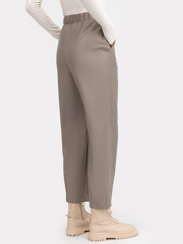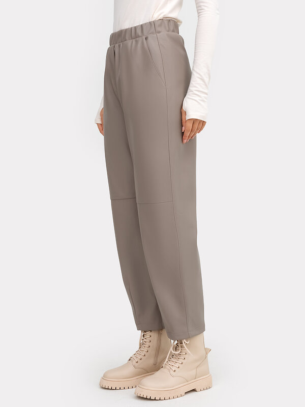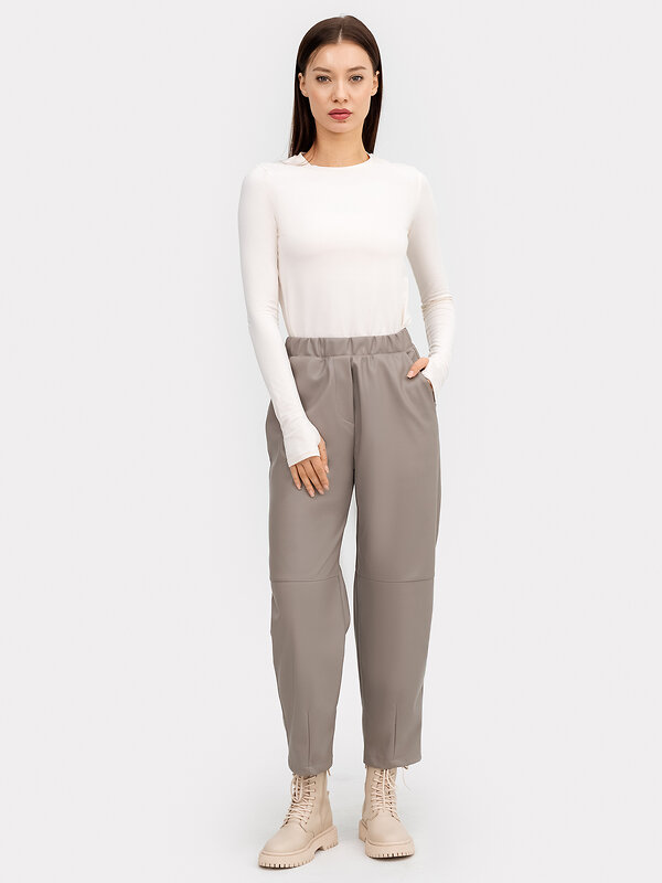Модные брюки женские бананы из высококачественного материала - экокожа. Пояс отрезной из основного полотна, передняя часть пояса гладкая, задняя часть с эластичной тесьмой внутри. В брюках карманы с отрезным бочком. На передних деталях горизонтальные членения и вытачки по низу. Комфортный мягкий материал хорошо ведет себя в носке, слегка тянется, не стесняет движений. Такие брюки женские отлично подходят для осенне-зимнего периода. Вариант брюк, который можно сочетать с массой других вещей из вашего гардероба за счет облегающего силуэта. В линейке широкий размерный ряд, есть модели для девушек plus-size. Красивые базовые и пастельные цвета. Если вы в поиске универсальных брюк на прохладное время года, обратите свое внимание на эту модель, она точно не оставит вас равнодушной. Купить женские брюки недорого можно у нас на сайте Mark Formelle и в магазине. Отличный подарок для себя и близких на любой праздник и просто без повода!
